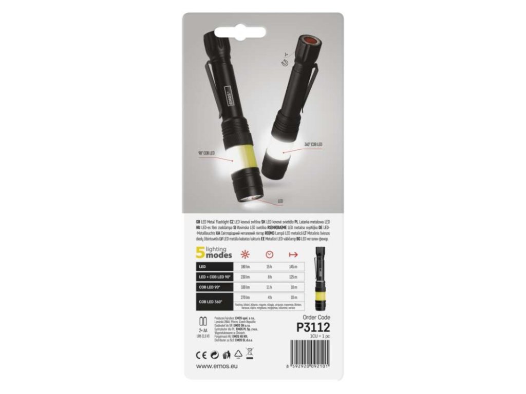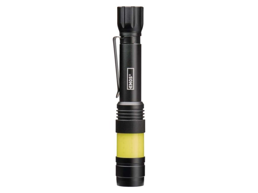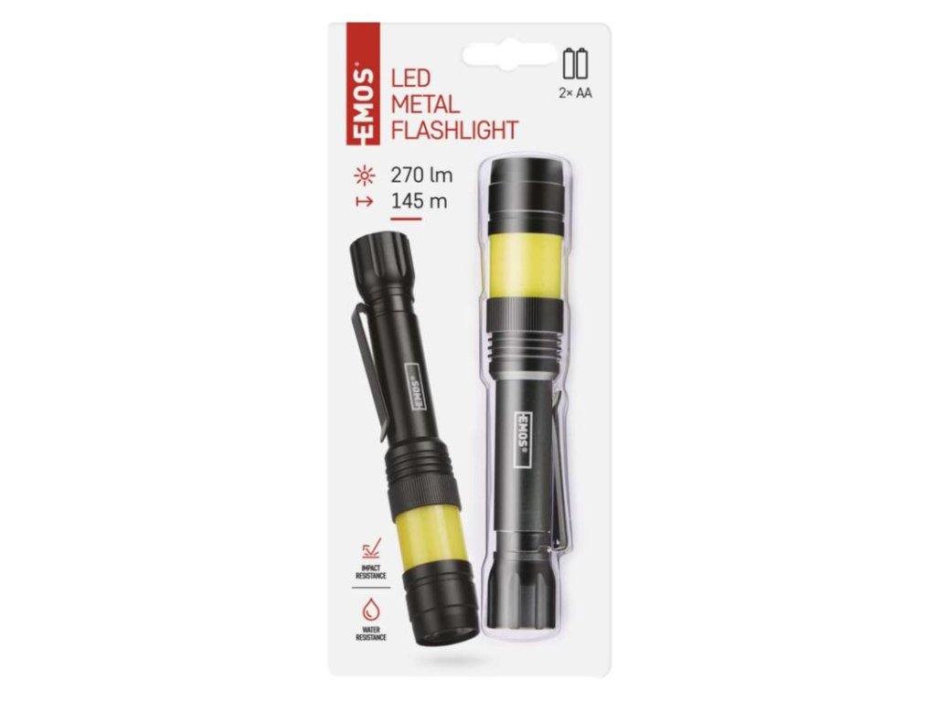 barva: černá|baterie součástí balení: ne|doba nabíjení: neuvádí se|doba svícení: 4–15 h|doba svícení detail: LED – 15 h , LED + COB LED 90° – 8 h, COB LED 90° – 11 h, COB LED 360° – 4 h|dosvit: LED – 145 m, LED + COB LED 90° – 125 m, COB LED 90° – 10 m, COB LED 360° – 10 m|fokus: ne|hmotnost: 108 g|LED indikace nabíjení: neuvádí se|LED indikace stavu akumulátoru: neuvádí se|materiál: hliník|maximální dosvit: 145 m|maximální světelný tok: 270 lm|nabíjecí: ne|napájení: 2× AA|nárazuvzdornost: ano|počet režimů svícení: 5|příslušenství: neuvádí se|prodejní obal: 1 ks, papírový blistr|režimy svícení: LED, LED + COB LED 90°, COB LED 90°, COB LED 360°, COB LED 360° blikání|rozměr: 171 × 30 × 30 mm|speciální funkce: neuvádí se|světelný tok: LED – 180 lm, LED + COB LED 90° – 230 lm, COB LED 90° – 100 lm, COB LED 360° – 270 lm|typ baterie: LR6 (1,5 V)|typ napájecího konektoru: neuvádí se|voděodolnost: ano (IP44)|vybavení: klip, 1× magnet|záruční doba: 2 roky|zdroj světla: COB LED + LED|značka: EMOSDoplňkové parametry