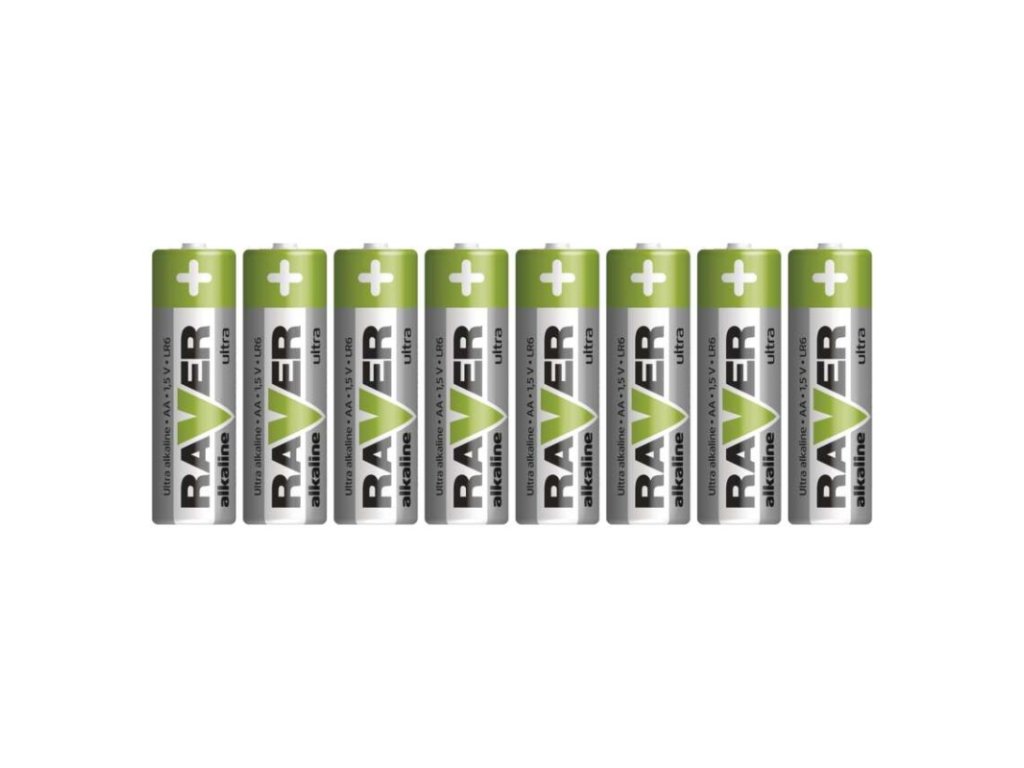 chemické složení: alkalické|hmotnost: 23,8 g|kapacita: neuvádí se|kategorie/řada: Ultra Alkaline|max. skladovatelnost: 7 let|možnost nabíjení: ne|napětí: 1,5 V|počet nabíjecích cyklů: nenabíjecí|prodejní obal: 8 ks, fólie|provozní teplota: -20 °C až +60 °C|rozměr: 14,5 × 50,5 mm|typ: LR6 (tužka, AA)|velikost baterie: AA|značka: RaverDoplňkové parametry