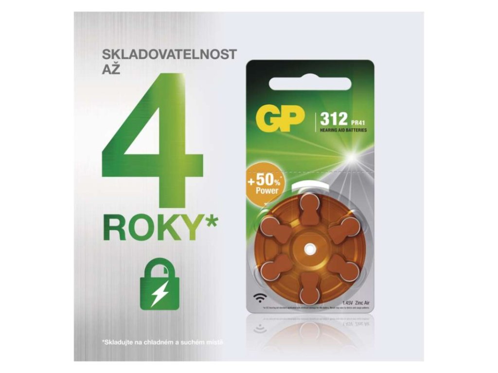 chemické složení: zinkovzdušné|hmotnost: 0,5 g|kapacita: 170 mAh (při zátěži 1,0 kOhm)|kategorie/řada: Hearing Aid|max. skladovatelnost: 3 roky|možnost nabíjení: ne|napětí: 1,45 V|počet nabíjecích cyklů: nenabíjecí|prodejní obal: 6 ks, blistr|provozní teplota: -10 °C až +50 °C|rozměr: 7,9 × 3,6 mm|typ: GP ZA312 (7002ZD, PR41)|velikost baterie: neuvádí se|značka: GPDoplňkové parametry