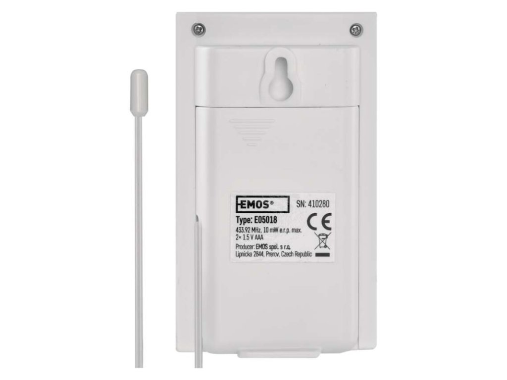 dosah ve volném prostoru: až 25 m|externí drátová teplotní sonda: ano|frekvence: 433 MHz|napájení: 2× 1,5 V AAA (nejsou součástí balení)|prodejní obal: 1 ks, krabička|provozní teplota: -50 °C až +70 °C, rozlišení 0,1 °C|rozměr: 21 × 60 × 100 mm|ukazatel venkovní vlhkosti: 20 % až 95 % RV, rozlišení 1 %|určeno pro typ hlavní jednotky: AOK-5018B, AOK-5060, S627BS, IB303TR, E0107T, IW001-DCF, IW003-DCF, E5068, E5062, E5063, E3078, E3028, E0300, E8236, E0211, E3010, E0127, E0329Doplňkové parametry