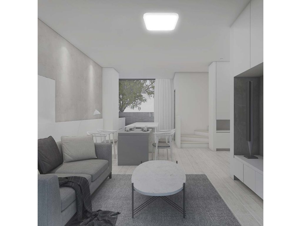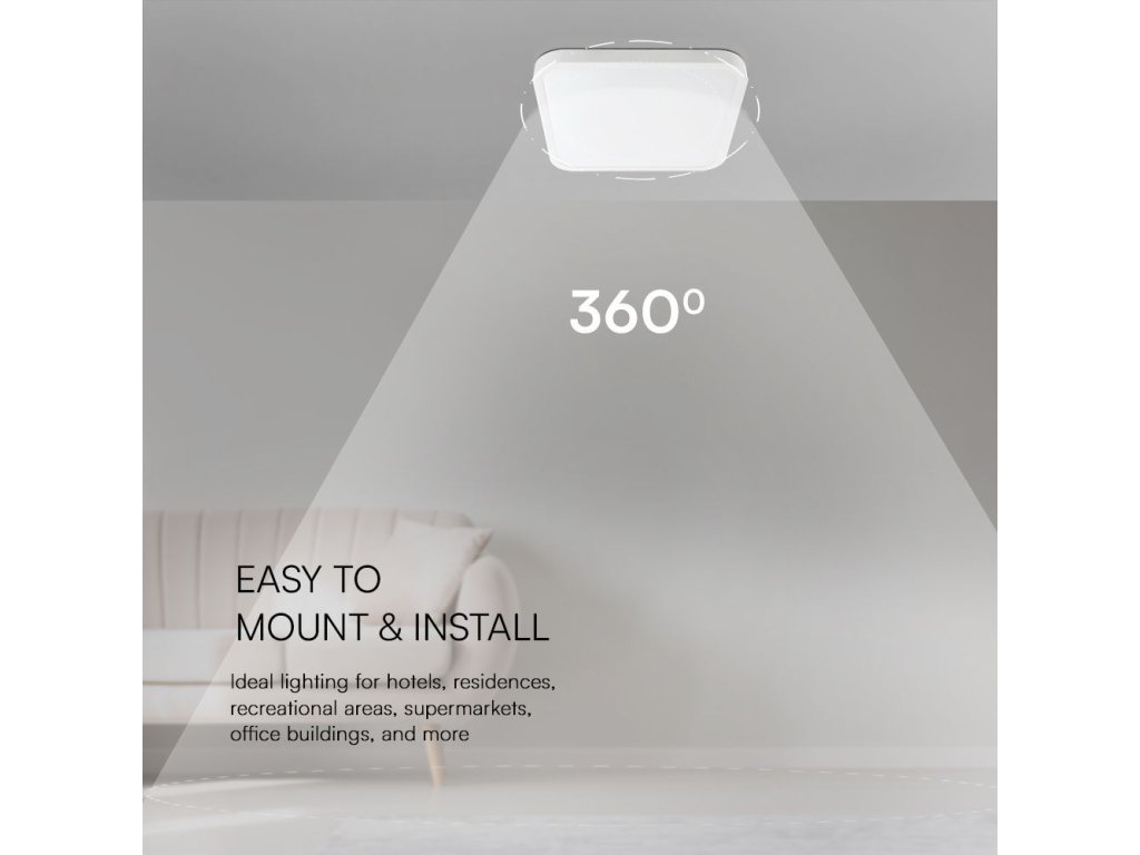 Elegantní čtvercové LED svítidlo o výkonu 48W a rozměru 42 x 42cm je uzpůsobené pro montáž přímo na strop. Řadí se do kategorie přisazených svítidel, čemuž odpovídá i jeho konstrukce. Velmi snadnou instalaci vám zajistí montážní konzole, která zakryje šrouby a díky tomu je svítidlo designově čisté. Do stropu stačí navrtat díry, osadit hmoždinkami a přišroubovat. Vstupní napětí je 230V. Vyznačuje se zvýšenou odolností proti vodě díky krytí IP44.