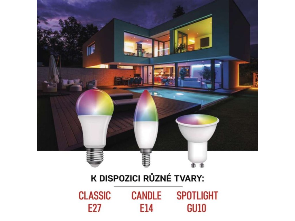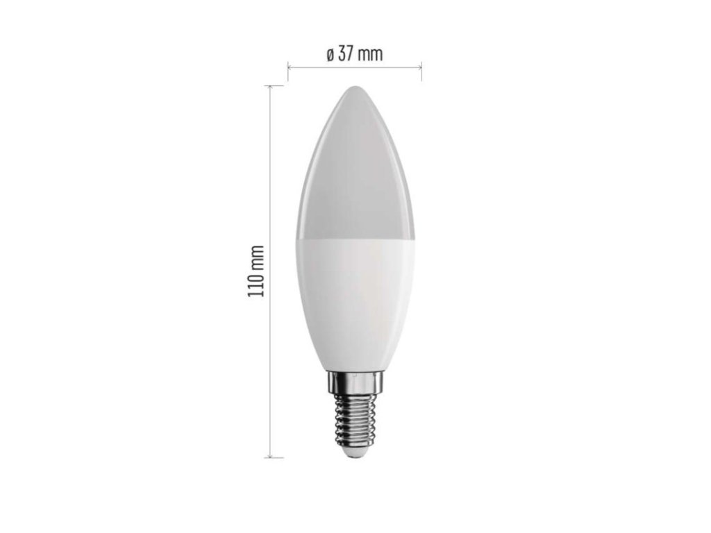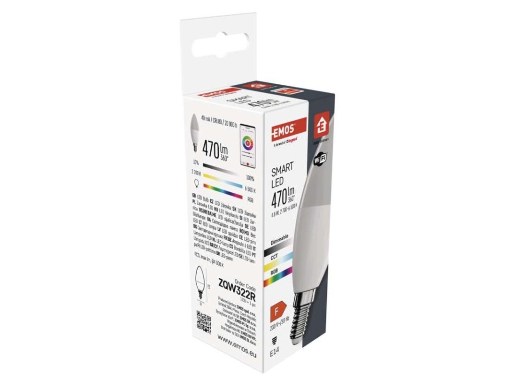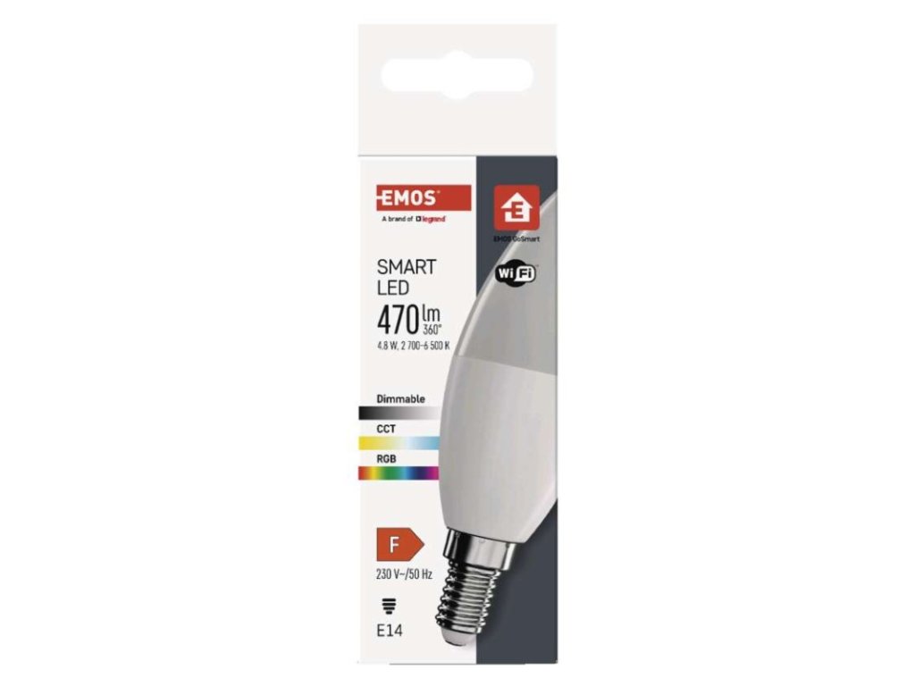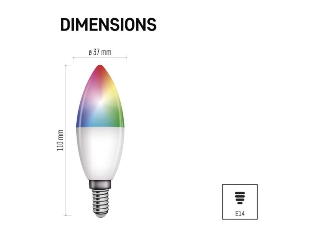barva světla: RGB|energetická třída: F|index podání barev (CRI): 80|kompatibilita: EMOS GoSmart, TUYA, LIDL, Smartlife|náhrada za žárovku: 40 W|napětí: 230 V~/50 Hz|nastavení barev (RGB): ano|notifikace do mobilní aplikace: ano|ovládání hlasovými asistenty: ano (Amazon Alexa, Google Assistant)|patice (uchycení žárovky): E14|počet čipů: neuvádí se|počet spínacích cyklů: 15 000|podporované OS: Android, iOS|přenosová frekvence: 2,4 GHz WIFI|příkon: 4,8 W|prodejní obal: 1 ks, krabička|protokol: Wi-Fi|řada: GoSmart|rozměr: 37 × 37 × 110 mm|stmívatelná: ano|světelná účinnost: 98 lm/W|světelný tok: 470 lm|technologie: LED|teplota chromatičnosti: 2 700–6 500 K|tvar: svíčka|typ čipů: SMD|účiník: 0,48|úhel vyzařování: 180°|záruční doba: 2 roky|životnost: 20 000 hodinDoplňkové parametry
