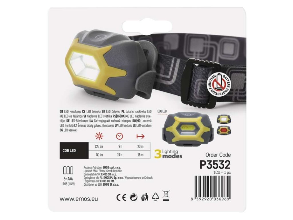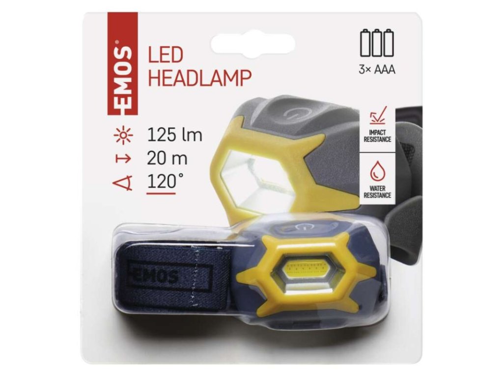 barva: šedo-žlutá|baterie součástí balení: ne|doba nabíjení: neuvádí se|doba svícení: 9–19 h|doba svícení detail: COB LED 100 % – 9 h, COB LED 50 % – 19 h|dosvit: COB LED 100 % – 20 m, COB LED 50 % – 15 m|fokus: ne|hmotnost: 54 g/89 g|LED indikace nabíjení: neuvádí se|LED indikace stavu akumulátoru: neuvádí se|materiál: ABS plast|maximální dosvit: 20 m|maximální světelný tok: 125 lm|nabíjecí: ne|napájení: 3× AAA|nárazuvzdornost: ano|počet režimů svícení: 3|příslušenství: neuvádí se|prodejní obal: 1 ks, papírový blistr|reflexní pásek: ne|režimy svícení: COB LED 100 %, COB LED 50 %, COB LED – červené blikání|rozměr: 69 × 43 × 46 mm|speciální funkce: ochrana baterie|světelný tok: COB LED 100 % – 125 lm, COB LED 50 % – 50 lm|typ baterie: LR03 (1,5 V)|typ napájecího konektoru: neuvádí se|úhel vyzařování: 120°|voděodolnost: ano (IP44)|vybavení: neuvádí se|záruční doba: 2 roky|zdroj světla: COB LED (bílá, červená)|značka: EMOSDoplňkové parametry
