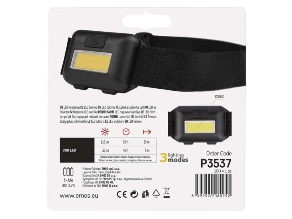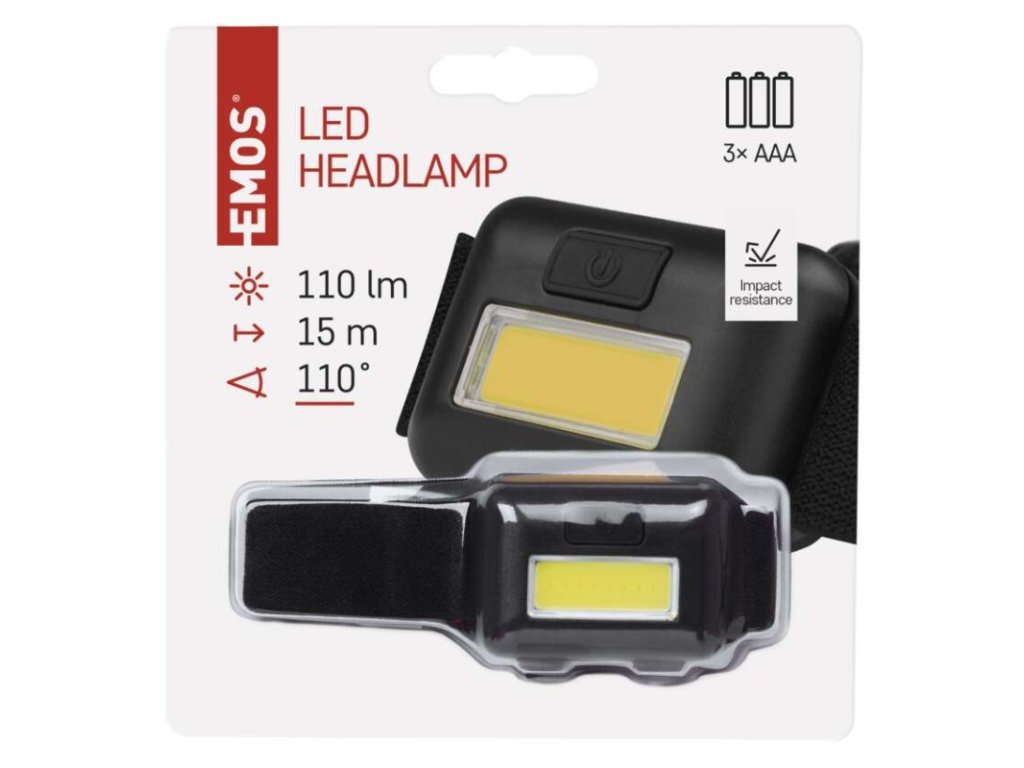 barva: černá|baterie součástí balení: ne|doba nabíjení: neuvádí se|doba svícení: 20–40 h|doba svícení detail: COB LED 100 % – 20 h, COB LED 50 % – 40 h|dosvit: COB LED 100 % – 15 m, COB LED 50 % – 8 m|fokus: ne|hmotnost: 21 g/56 g|LED indikace nabíjení: neuvádí se|LED indikace stavu akumulátoru: neuvádí se|materiál: ABS plast|maximální dosvit: 15 m|maximální světelný tok: 110 lm|nabíjecí: ne|napájení: 3× AAA|nárazuvzdornost: ano|počet režimů svícení: 3|příslušenství: neuvádí se|prodejní obal: 1 ks, papírový blistr|reflexní pásek: ne|režimy svícení: COB LED 100 %, COB LED 50 %, blikání|rozměr: 60 × 18 × 40 mm|speciální funkce: neuvádí se|světelný tok: COB LED 100 % – 110 lm, COB LED 50 % – 30 lm|typ baterie: LR03 (1,5 V)|typ napájecího konektoru: neuvádí se|úhel vyzařování: 110°|voděodolnost: ne|vybavení: neuvádí se|záruční doba: 2 roky|zdroj světla: COB LED|značka: EMOSDoplňkové parametry