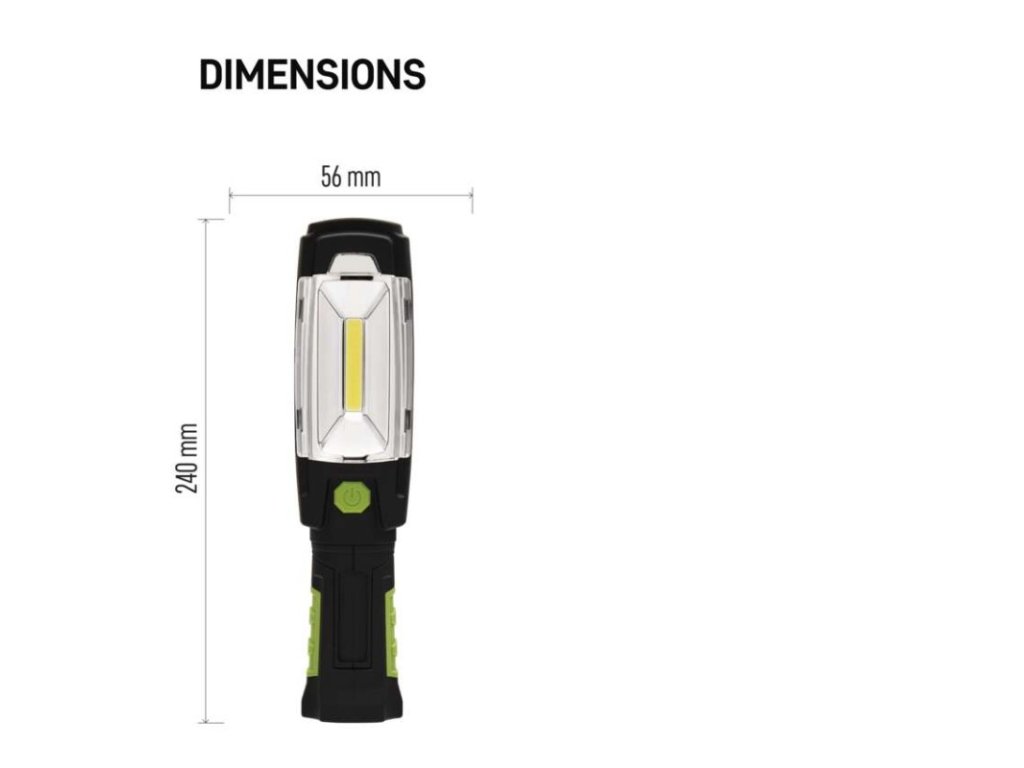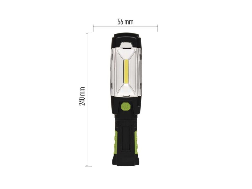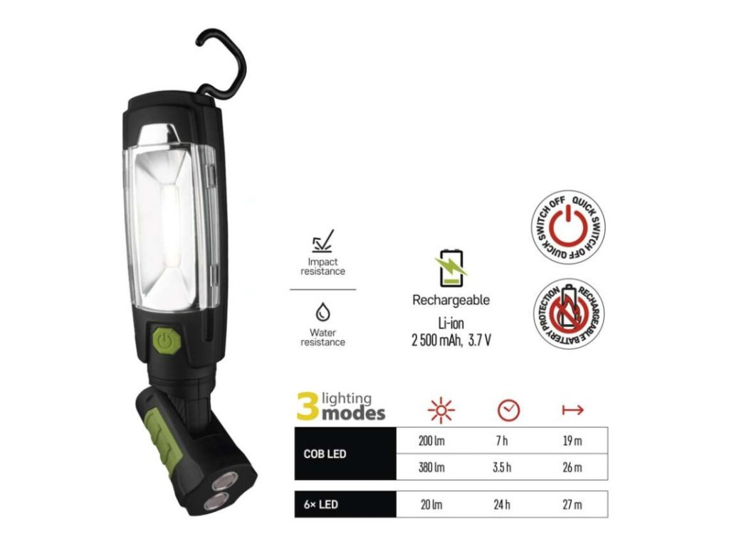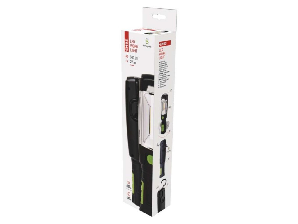 barva: černo-zelená|baterie součástí balení: ano|doba nabíjení: 4 h|doba svícení: 3,5–24 h|doba svícení detail: COB LED 50 % – 7 h, COB LED 100 % – 3,5 h, LED 100 % – 24 h|dosvit: COB LED 50 % – 19 m, COB LED 100 % – 26 m, LED 100 % – 27 m|fokus: ne|hmotnost: 265 g|LED indikace nabíjení: ano|LED indikace stavu akumulátoru: neuvádí se|materiál: ABS plast|maximální dosvit: 27 m|maximální světelný tok: 380 lm|nabíjecí: ano|napájení: Li-Ion akupack|nárazuvzdornost: ano|počet režimů svícení: 3|příslušenství: napájecí adaptér do sítě, napájecí adaptér do automobilu|prodejní obal: 1 ks, krabice|režimy svícení: COB LED 50 %, COB LED 100 %, LED 100 %|rozměr: 56 × 50 × 240 mm|speciální funkce: funkce rychlého vypnutí, funkce ochrany baterie|světelný tok: COB LED 50 % – 200 lm, COB LED 100 % – 380 lm, LED 100 % – 20 lm|typ baterie: 2 500 mAh/3,7 V|typ napájecího konektoru: –|voděodolnost: ano (IP43)|vybavení: otočná rukojeť, 1× hák, 2× magnet|záruční doba: 2 roky|zdroj světla: COB LED + LED|značka: EMOSDoplňkové parametry