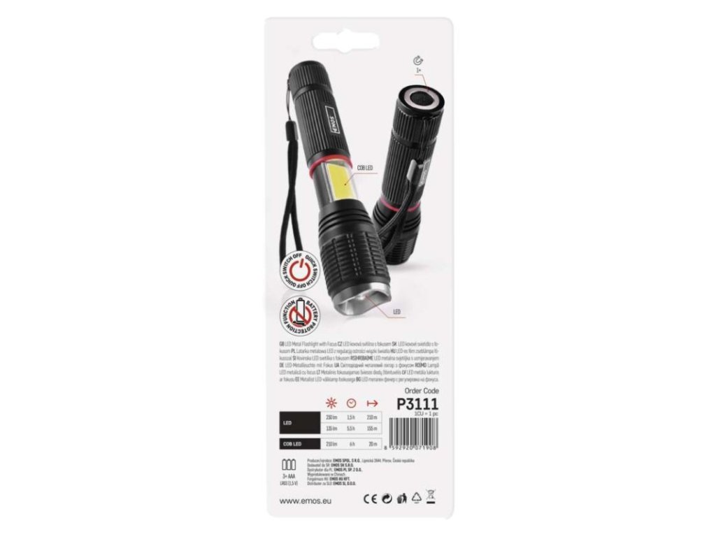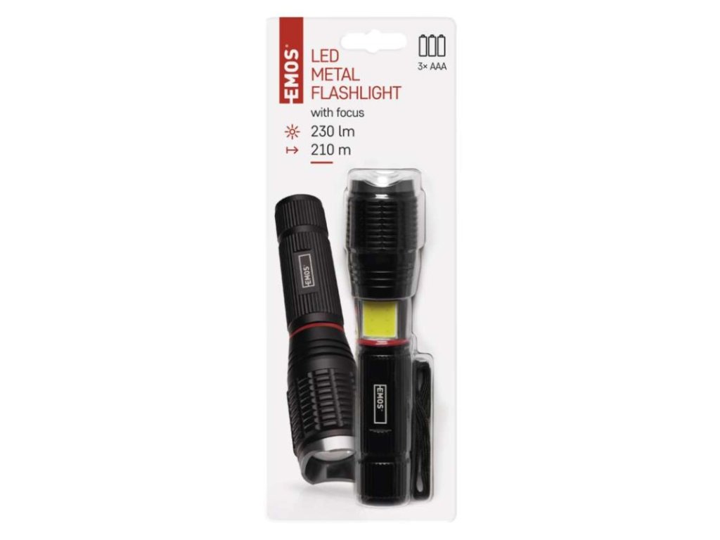 barva: černá|baterie součástí balení: ne|doba nabíjení: neuvádí se|doba svícení: 1,5–6 h|doba svícení detail: LED 100 % – 1,5 h, LED 50 % – 5,5 h, COB LED – 6 h|dosvit: LED 100 % – 210 m, LED 50 % – 155 m, COB LED – 20 m|fokus: ano|hmotnost: 158 g|LED indikace nabíjení: neuvádí se|LED indikace stavu akumulátoru: neuvádí se|materiál: hliník|maximální dosvit: 210 m|maximální světelný tok: 230 lm|nabíjecí: ne|napájení: 3× AAA|nárazuvzdornost: ne|počet režimů svícení: 3|příslušenství: neuvádí se|prodejní obal: 1 ks, blistr|režimy svícení: LED 100 %, LED 50 %, COB LED|rozměr: 150 × 37 × 37 mm|speciální funkce: funkce rychlého vypnutí, funkce ochrany baterie|světelný tok: LED 100 % – 230 lm, LED 50 % – 135 lm, COB LED – 210 lm|typ baterie: LR03 (1,5 V)|typ napájecího konektoru: neuvádí se|voděodolnost: ne|vybavení: poutko, 1× magnet|záruční doba: 2 roky|zdroj světla: LED + COB LED|značka: EMOSDoplňkové parametry