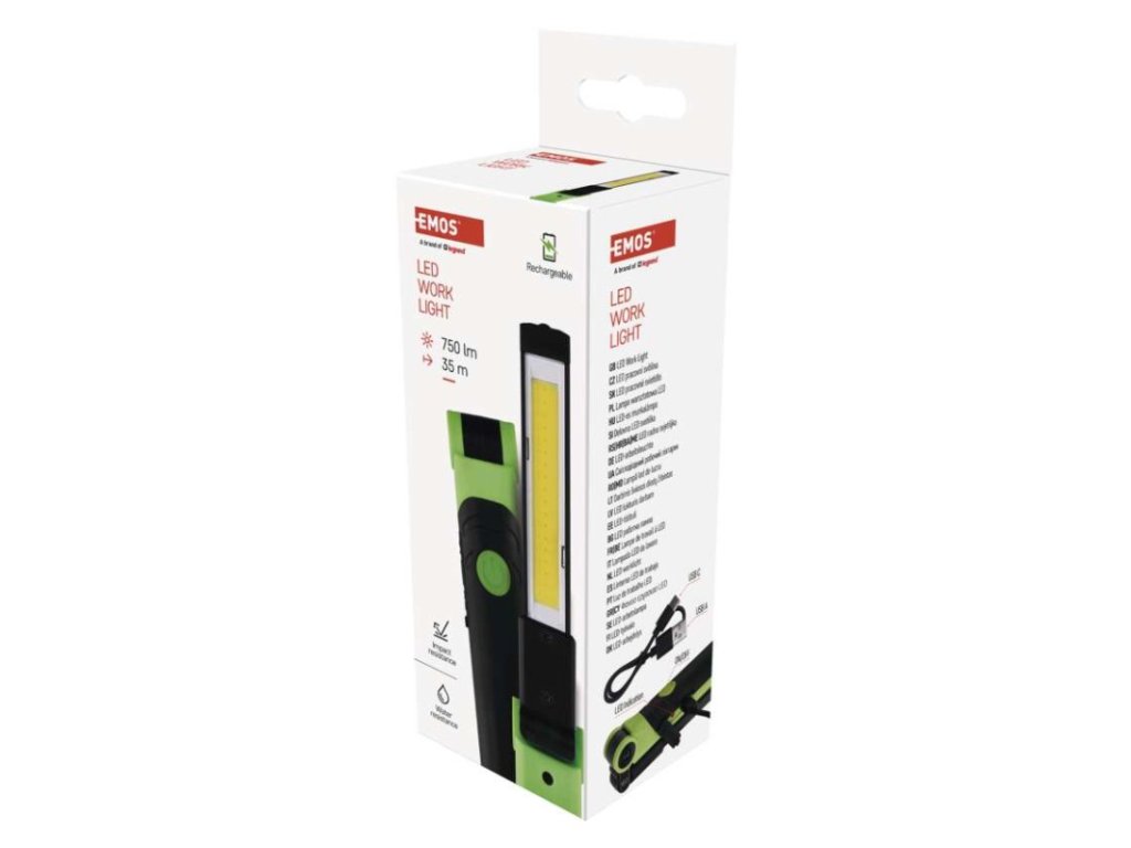 barva: zeleno-černá|baterie součástí balení: ano|doba nabíjení: 2,5 h|doba svícení: 2–13 h|doba svícení detail: COB LED 100 % – 2 h, COB LED 40 % – 2,5 h, COB LED 20 % – 4 h, SMD LED 100 % – 13 h|dosvit: COB LED 100 % – 35 m, COB LED 40 % – 25 m, COB LED 20 % – 15 m, SMD LED 100 % – 20 m|fokus: ne|hmotnost: 118 g|LED indikace nabíjení: ano|LED indikace stavu akumulátoru: ne|materiál: plast|maximální dosvit: 35 m|maximální světelný tok: 750 lm|nabíjecí: ano|napájení: Li-Ion|nárazuvzdornost: ano|počet režimů svícení: 6|příslušenství: USB kabel|prodejní obal: 1 ks, krabice|režimy svícení: COB LED 100 %, COB LED 40 %, COB LED 20 %, červené COB LED svícení, červené COB LED blikání, SMD LED 100 %|rozměr: 28 × 35 × 147/285 mm|speciální funkce: funkce rychlého vypnutí, funkce ochrany baterie|světelný tok: COB LED 100 % – 750 lm, COB LED 40 % – 300 lm, COB LED 20 % – 150 lm, SMD LED 100 % – 100 lm|typ baterie: 2 000 mAh/3,7 V|typ napájecího konektoru: USB C|voděodolnost: ano (IP44)|vybavení: otočný reflektor, magnet, hák|záruční doba: 2 roky|zdroj světla: COB LED + SMD LED|značka: EMOSDoplňkové parametry