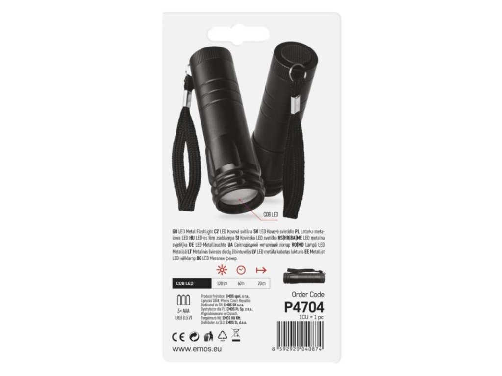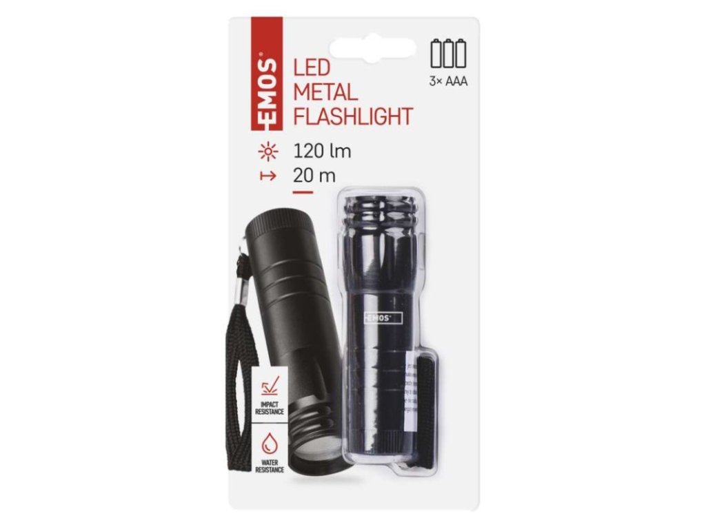 barva: černá|baterie součástí balení: ne|doba nabíjení: neuvádí se|doba svícení: 60 h|doba svícení detail: COB LED 100 % – 28 h|dosvit: COB LED 100 % – 20 m|fokus: ne|hmotnost: neuvádí se|LED indikace nabíjení: neuvádí se|LED indikace stavu akumulátoru: neuvádí se|materiál: hliník|maximální dosvit: 20 m|maximální světelný tok: 120 lm|nabíjecí: ne|napájení: 3× AAA|nárazuvzdornost: ano|počet režimů svícení: 1|příslušenství: neuvádí se|prodejní obal: 1 ks, blistr|režimy svícení: COB LED 100 %|rozměr: 102 × 28 × 28 mm|speciální funkce: neuvádí se|světelný tok: COB LED 100 % – 120 lm|typ baterie: LR03 (1,5 V)|typ napájecího konektoru: neuvádí se|voděodolnost: ano (IP43)|vybavení: poutko|záruční doba: 2 roky|zdroj světla: COB LED|značka: EMOSDoplňkové parametry