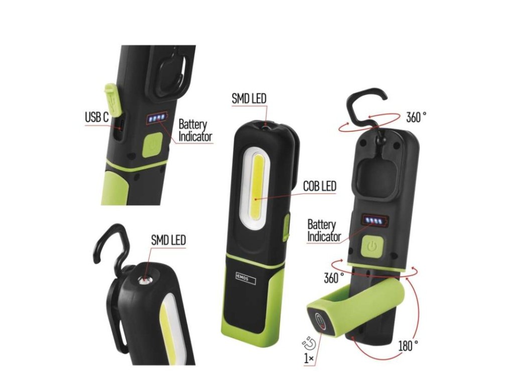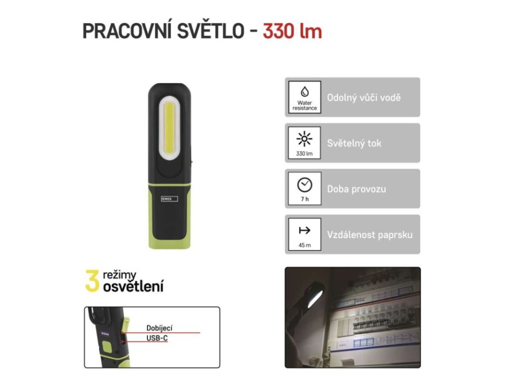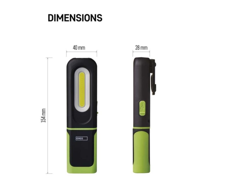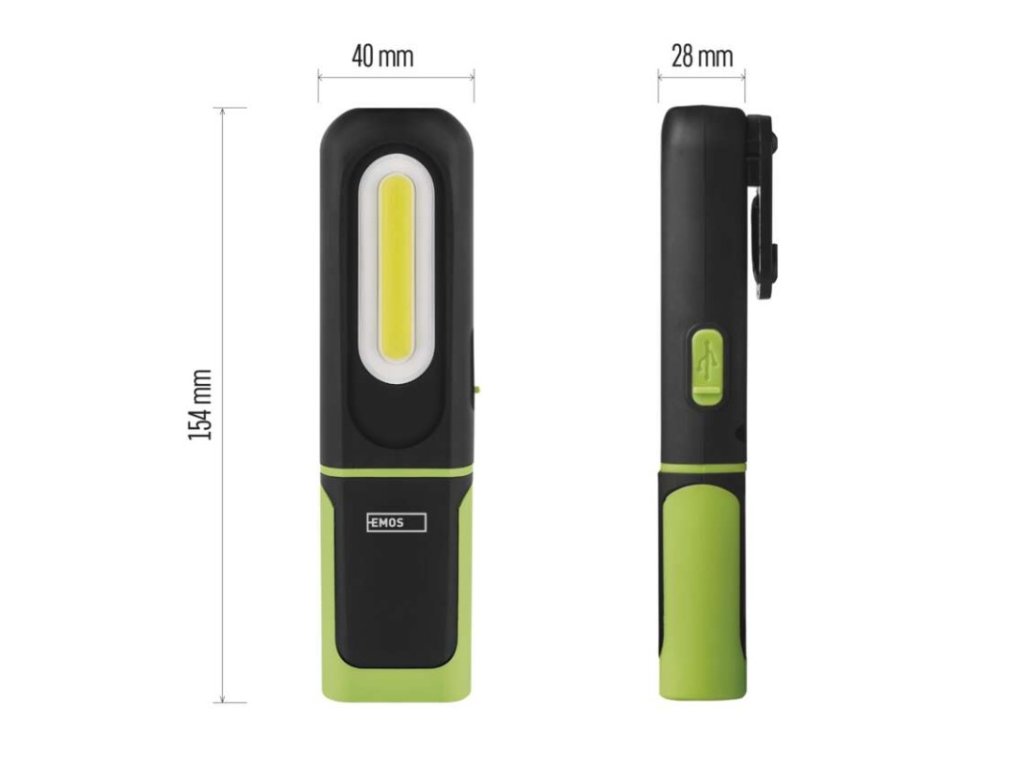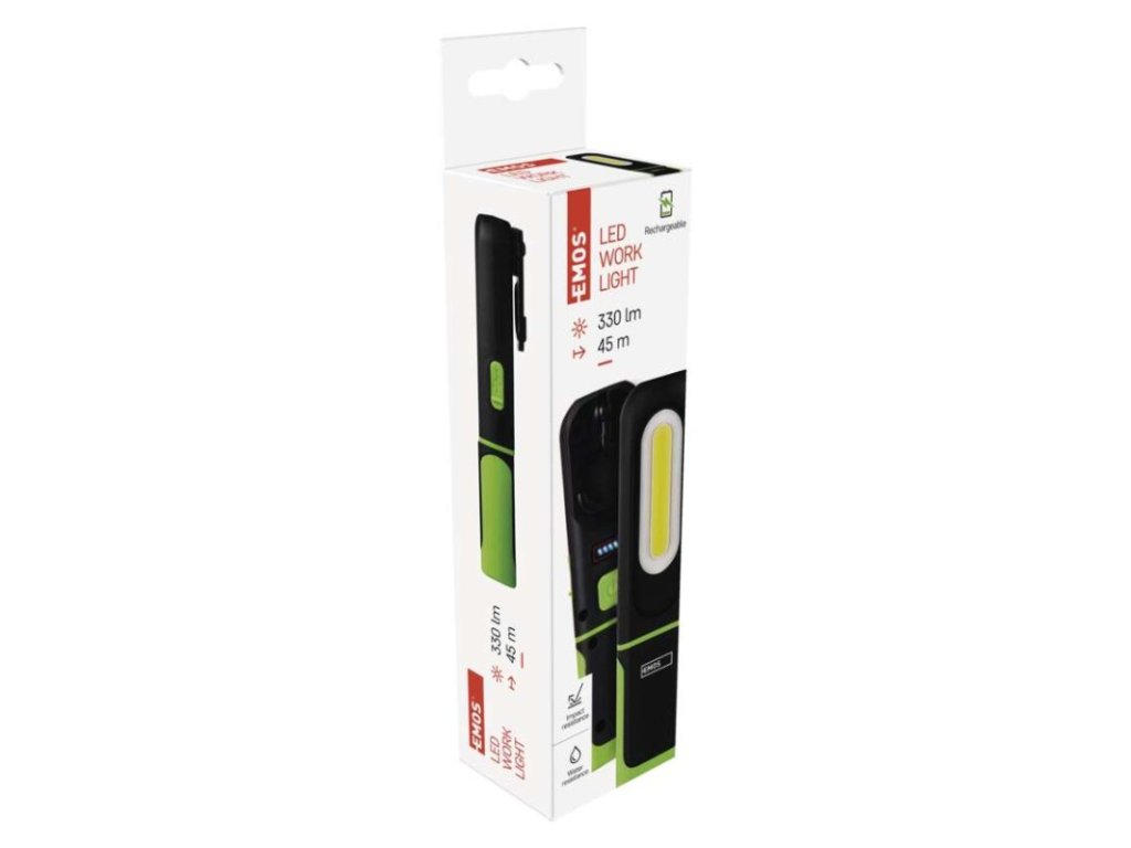 barva: zeleno-černá|baterie součástí balení: ano|doba nabíjení: 2–4 h|doba svícení: 3–7 h|doba svícení detail: COB LED 100 % – 3 h, COB LED 33 % – 5,5 h, SMD LED 100 % – 7 h|dosvit: COB LED 100 % – 25 m, COB LED 33 % – 15 m, SMD LED 100 % – 45 m|fokus: ne|hmotnost: 110 g|LED indikace nabíjení: ano|LED indikace stavu akumulátoru: ano|materiál: ABS plast + guma|maximální dosvit: 45 m|maximální světelný tok: 330 lm|nabíjecí: ano|napájení: Li-Ion|nárazuvzdornost: ano|počet režimů svícení: 3|příslušenství: USB kabel|prodejní obal: 1 ks, krabice|režimy svícení: COB LED 100 %, COB LED 33 %, SMD LED 100 %|rozměr: 41 × 29 × 154 mm|speciální funkce: funkce rychlého vypnutí, funkce ochrany baterie|světelný tok: COB LED 100 % – 330 lm, COB LED 33 % – 100 lm, SMD LED 100 % – 60 lm|typ baterie: 1 200 mAh/3,7 V|typ napájecího konektoru: USB C|voděodolnost: ano (IP43)|vybavení: otoč. nakl. rukojeť, 1× klip, magnet, hák|záruční doba: 2 roky|zdroj světla: COB LED + SMD LED|značka: EMOSDoplňkové parametry