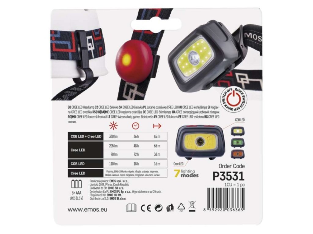 barva: šedá|baterie součástí balení: 1× CR2032|doba nabíjení: neuvádí se|doba svícení: 18–72 h|doba svícení detail: COB LED + CREE LED 100 % – 36 h, CREE LED 100 % – 48 h, CREE LED 50 % – 72 h, COB LED 100 % – 18 h|dosvit: COB LED + CREE LED 100 % – 65 m, CREE LED 100 % – 65 m, CREE LED 50 % – 38 m, COB LED 100 % – 16 m|fokus: ne|hmotnost: 80 g/115 g|LED indikace nabíjení: neuvádí se|LED indikace stavu akumulátoru: neuvádí se|materiál: ABS plast|maximální dosvit: 65 m|maximální světelný tok: 330 lm|nabíjecí: ne|napájení: 3× AAA + 1× CR2032|nárazuvzdornost: ano|počet režimů svícení: 7|příslušenství: háčky na helmu|prodejní obal: 1 ks, papírový blistr|reflexní pásek: ano|režimy svícení: COB LED + CREE LED 100 %, CREE LED 100 %, CREE LED 50 %, CREE LED – blikání, COB LED – bílá, COB LED – zelená, COB LED – červená|rozměr: 65 × 32 × 39 mm|speciální funkce: rychlé vypnutí|světelný tok: COB LED + CREE LED 100 % – 330 lm, CREE LED 100 % – 205 lm, CREE LED 50 % – 70 lm, COB LED 100 % – 110 lm|typ baterie: LR03 (1,5 V) + CR2032 (3 V)|typ napájecího konektoru: neuvádí se|úhel vyzařování: 25°/110°|voděodolnost: ano (IP44)|vybavení: zadní červené LED světlo, píšťalka, háček|záruční doba: 2 roky|zdroj světla: CREE LED + COB LED (zelená, červená) + červená LED (zadní světlo)|značka: EMOSDoplňkové parametry