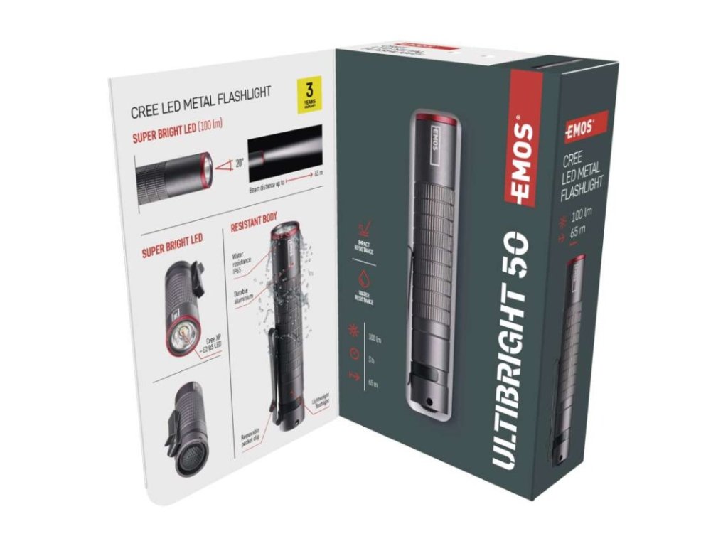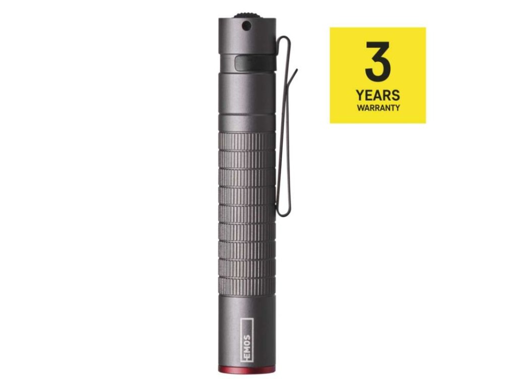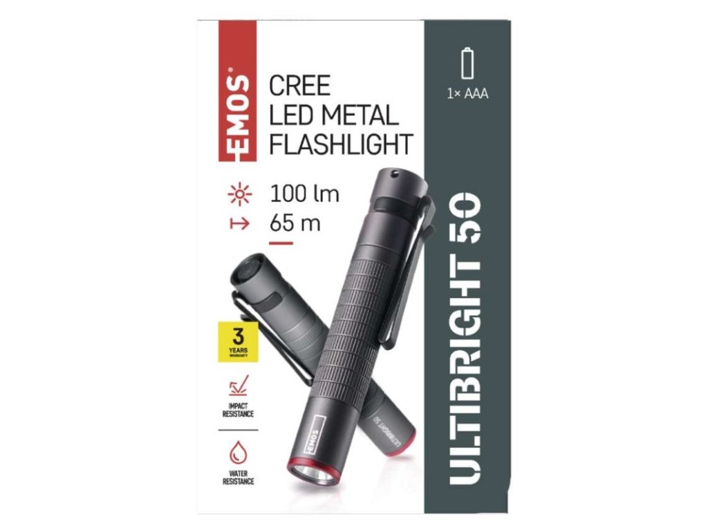 barva: šedá|baterie součástí balení: ne|doba nabíjení: neuvádí se|doba svícení: 3 h|doba svícení detail: CREE LED 100 % – 3 h|dosvit: CREE LED 100 % – 65 m|fokus: ne|hmotnost: 32 g|LED indikace nabíjení: neuvádí se|LED indikace stavu akumulátoru: neuvádí se|materiál: hliník|maximální dosvit: 65 m|maximální světelný tok: 100 lm|nabíjecí: ne|napájení: 1× AAA|nárazuvzdornost: ano|počet režimů svícení: 1|příslušenství: neuvádí se|prodejní obal: 1 ks, krabice|režimy svícení: CREE LED 100 %|rozměr: 98 × 16 × 16 mm|speciální funkce: neuvádí se|světelný tok: CREE LED 100 % – 100 lm|typ baterie: LR03 (1,5 V)|typ napájecího konektoru: neuvádí se|voděodolnost: ano (IP65)|vybavení: klip, poutko|záruční doba: 3 roky|zdroj světla: CREE LED|značka: EMOSDoplňkové parametry