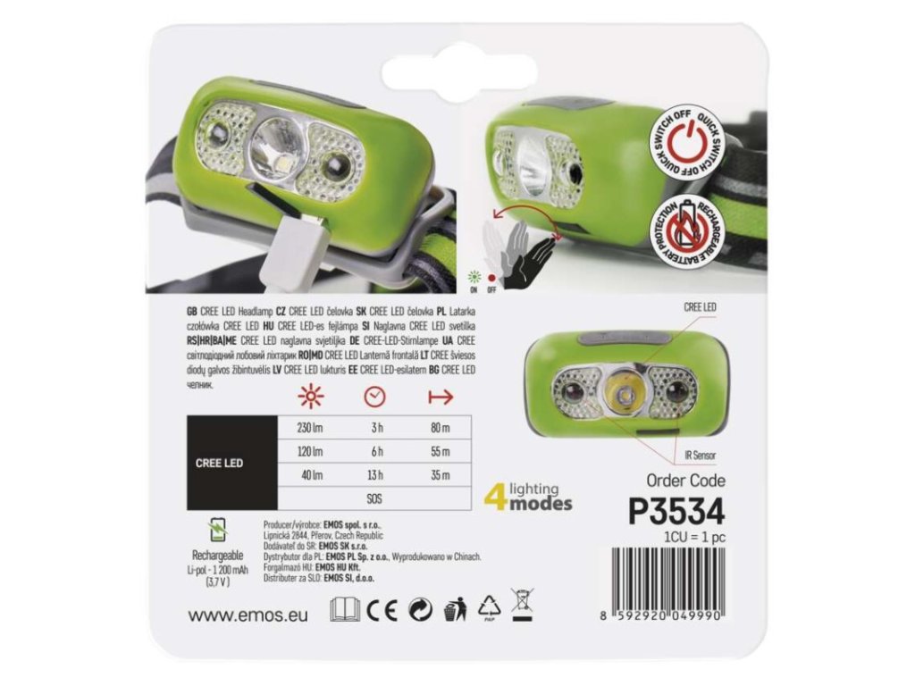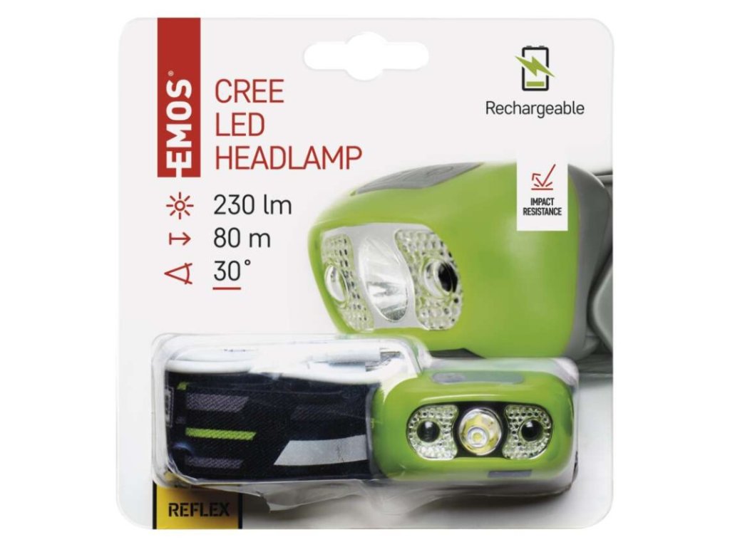 barva: zelená|baterie součástí balení: ano|doba nabíjení: 3 h|doba svícení: 3–13 h|doba svícení detail: CREE LED 100 % – 3 h, CREE LED 50 % – 6 h, CREE LED 20 % – 13 h|dosvit: CREE LED 100 % – 80 m, CREE LED 50 % – 55 m, CREE LED 20 % – 35 m|fokus: ne|hmotnost: 60 g|LED indikace nabíjení: ano|LED indikace stavu akumulátoru: ne|materiál: ECO–PC plast|maximální dosvit: 80 m|maximální světelný tok: 230 lm|nabíjecí: ano|napájení: Li-pol|nárazuvzdornost: ano|počet režimů svícení: 4|příslušenství: napájecí kabel|prodejní obal: 1 ks, papírový blistr|reflexní pásek: ano|režimy svícení: CREE LED 100 %, CREE LED 50 %, CREE LED 20 %, SOS|rozměr: 61 × 37 × 31 mm|speciální funkce: zapnutí pohybem ruky, rychlé vyp. , ochrana baterie|světelný tok: CREE LED 100 % – 230 lm, CREE LED 50 % – 120 lm, CREE LED 20 % – 40 lm|typ baterie: 1 200 mAh (3,7 V)|typ napájecího konektoru: micro USB B|úhel vyzařování: 30°|voděodolnost: ne|vybavení: neuvádí se|záruční doba: 2 roky|zdroj světla: CREE LED|značka: EMOSDoplňkové parametry