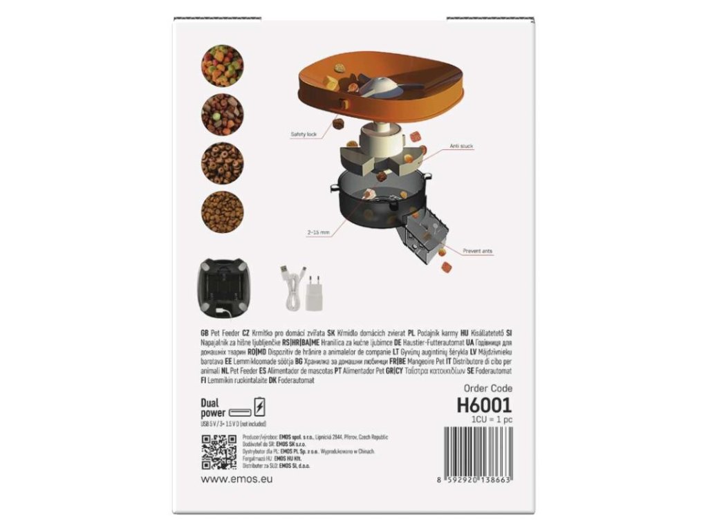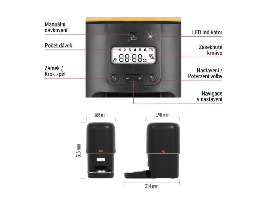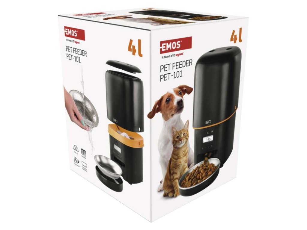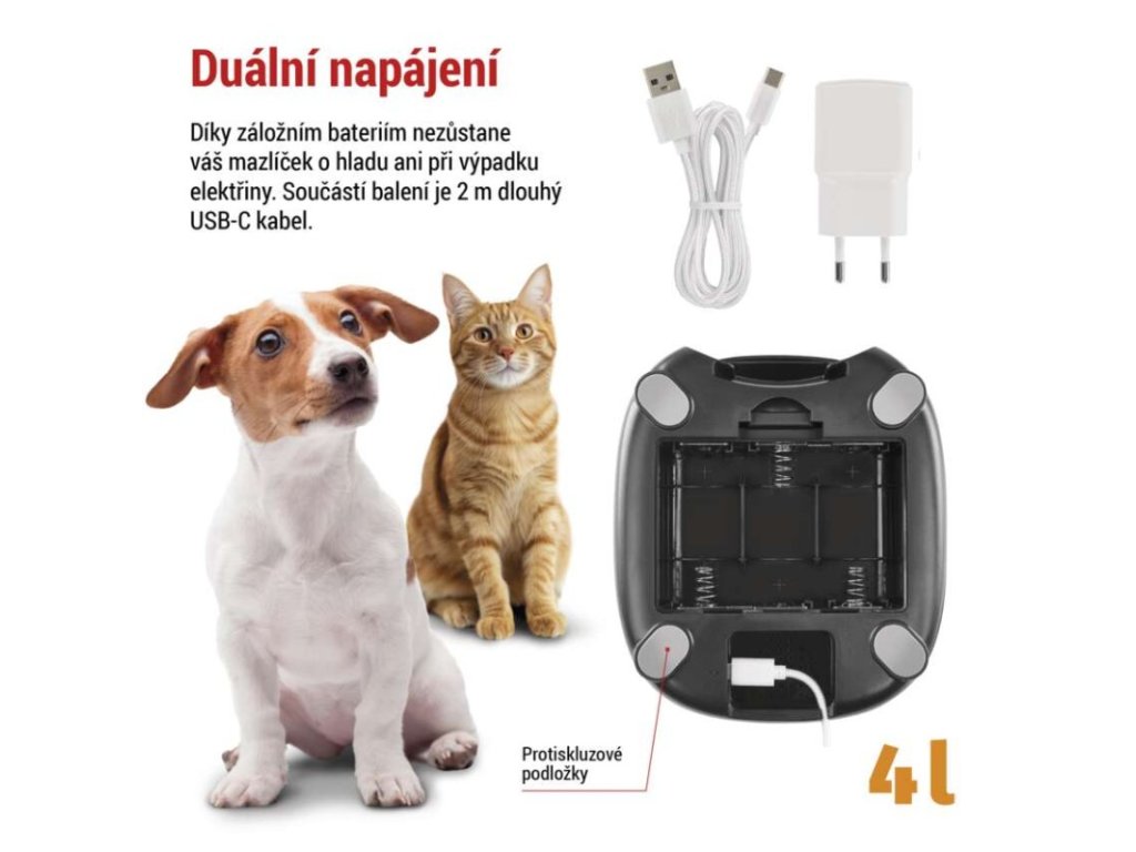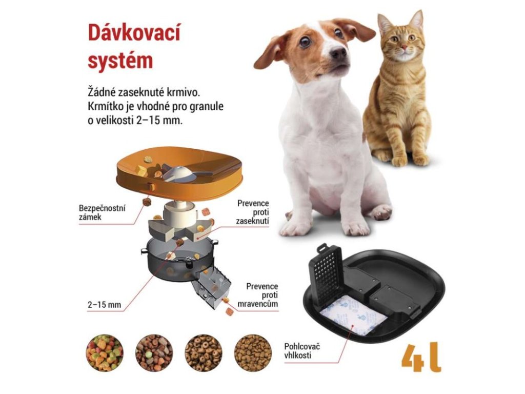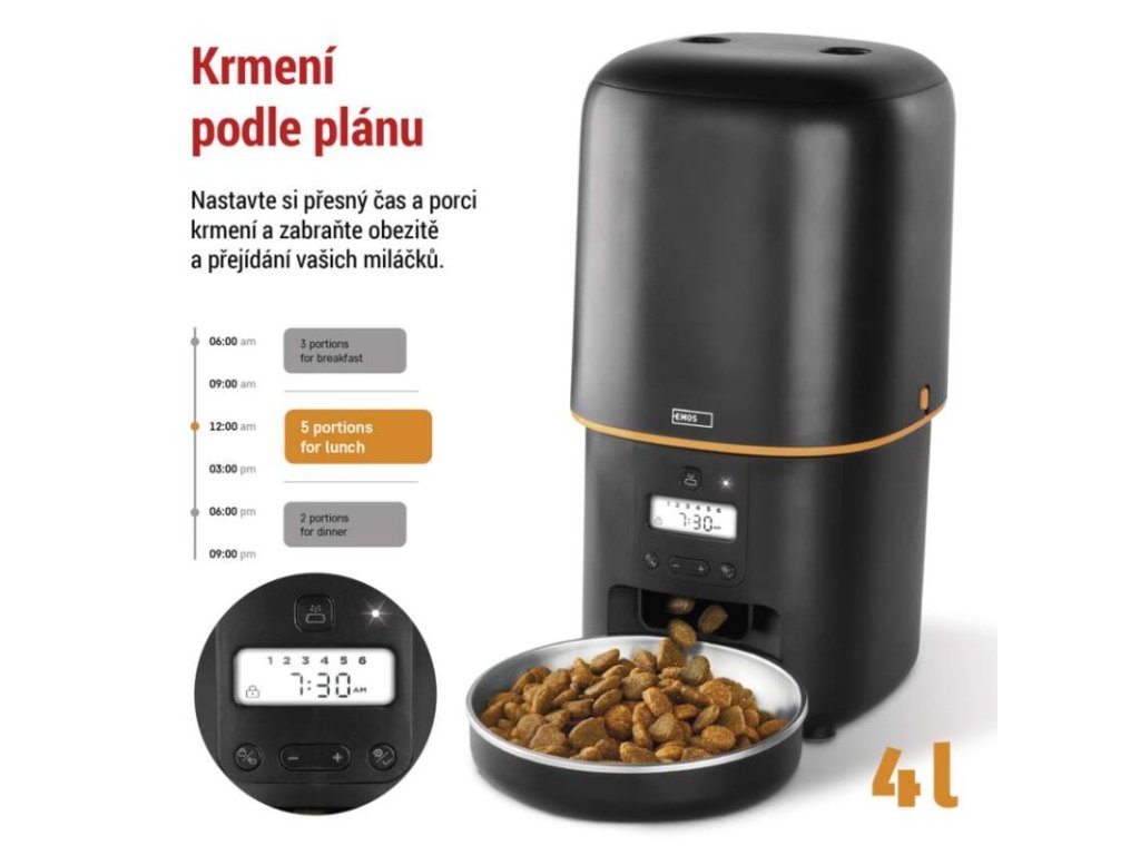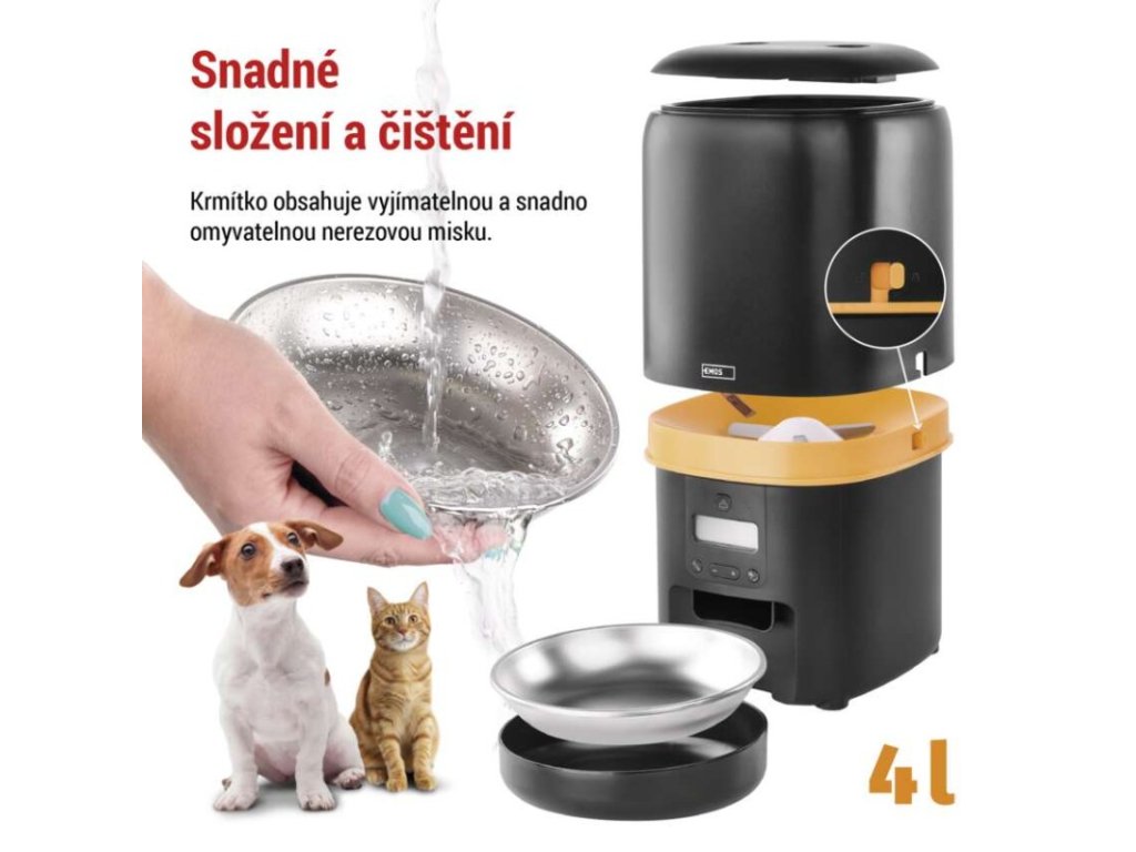 barva: černá|další funkce: vyjímatelná nerezová miska|detekce pohybu: –|detekce zvuku: –|doporučení: malá a střední plemena|funkce WebRTC: –|hlasová komunikace: –|instalační materiál: –|IR CUT: –|jazyky aplikace: –|jedna porce: 5 g|kapacita: 4 l|kompatibilita: –|maximální úhel záběru kamery: –|napájení: 5 V/1 A / 3× 1,5 V typ D|noční vidění: –|notifikace do mobilní aplikace: –|obsah balení: krmítko, napájecí adaptér, přívodní kabel|ovládání hlasovými asistenty: –|podporované OS: –|přenosová frekvence: –|prodejní obal: 1 ks, krabice|protokol: –|průměr granulí: 2–15 mm|řada: –|rozlišení kamery: –|rozměr: 315 × 314 × 168 mm|typ produktu: chytré krmítko|ukládání na cloud: –|ukládání na SD kartu: –|určení: vnitřní|vyvolání hovoru tlačítkem: –|záruční doba: 2 roky|zdroj součástí balení: anoDoplňkové parametry