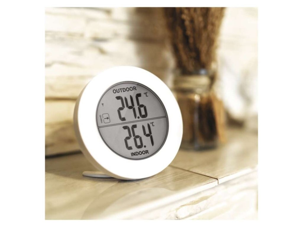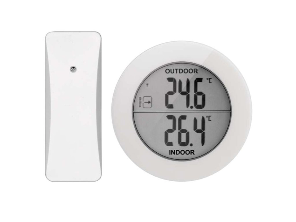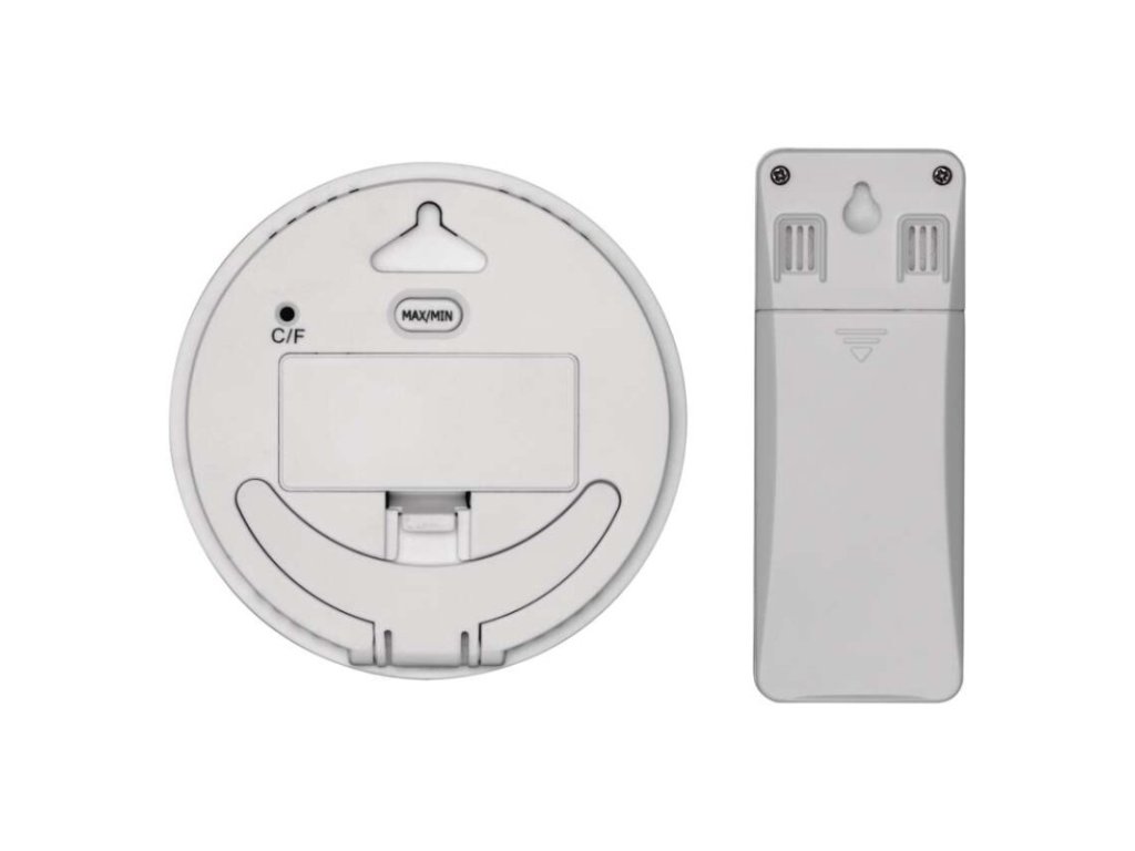 12/24 formát času: ne|barevný displej (black mask) podsvícený: ne|budík: ne|časová pásma: ne|datum: ne|dosah ve volném prostoru: až 80 m|drátová sonda k čidlu: ne|funkce stopky: ne|hodiny: ne|kalendář: ne|LED podsvícení displeje: ne|magnet na připevnění: ne|min. a max. teplota: ano|možné další čidlo: 1 (E05018)|možnost nastavení jednotky teploty: ano|možnost pověšení na zeď: ano|napájení čidla: 2× 1,5 V AAA (nejsou součástí balení)|napájení stanice: 2× 1,5 V AAA (nejsou součástí balení)|odpočet času max. od: ne|opakované buzení: ne|paměť poslední hodnoty: ne|podporované OS: –|přenosová frekvence: 433 MHz|prodejní obal: 1 ks, krabička|provedení teploměru: bezdrátový|rozměr čidla: 31 × 19 × 100 mm|rozměr hlavní jednotky: 91,8 × 20 × 91,8 mm|síťový adaptér: ne|teplotní index: ne|teplotní výstraha: ne|trend teploty: ano|trend tlaku: ne|trvalé podsvícení: ne|velikost displeje: Ø 64 mm|venkovní teplota: -30 °C až +50 °C, rozlišení 0,1 °C|venkovní vlhkost: ne|vnitřní teplota: -10 °C až +50 °C, rozlišení 0,1 °C|vnitřní vlhkost: neDoplňkové parametry