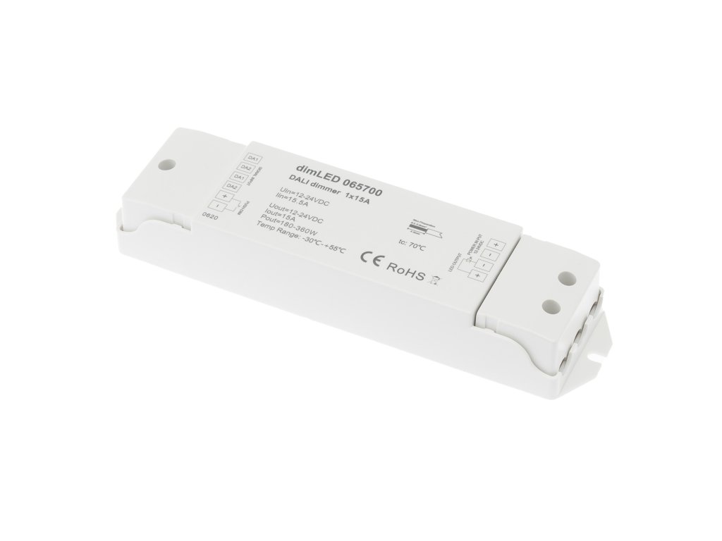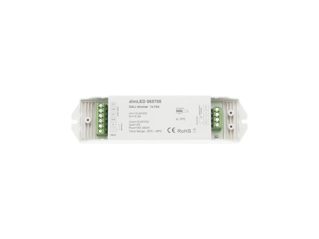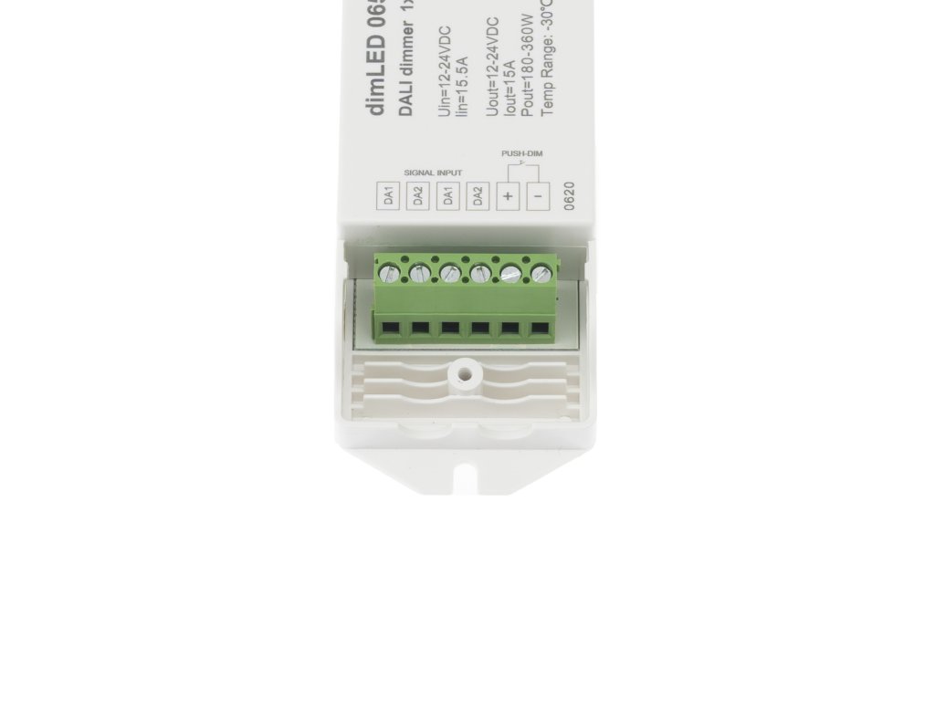 Digitální rozhraní DALI ( Digital Addressable Lighting Interface ), tento LED převodník slouží pro PWM stmívání LED komponent v systému inteligentního řízení osvětlení na bázi protokolu DALI standardu. Kompatibilní se všemi mezinárodně uznávanými DALI protokoly (např. IEC 62386-102, IEC 62386-207 a další). Dali převodník má možnost ovládání tlačítkem. Specifikace LED stmívače Napájecí napětí 12 - 24VDC Výstup 1 kanál (stejné napětí jako napájecí napětí) PWM frekvence PWM 500Hz Adresování Automatické načtení DALI adres z hlavního DALI ovladače Externí rozměr 175 x 45 x 27 mm Hmotnost 105 g Režim připojení Svorkovnice Výstupní proud Max 15A Výstupní výkon 180W(12V) až 360W(24V) Krytí IP20 Pracovní teplota -20 - 50 ° C Typ stmívání PWM modulaceDoplňkové parametry