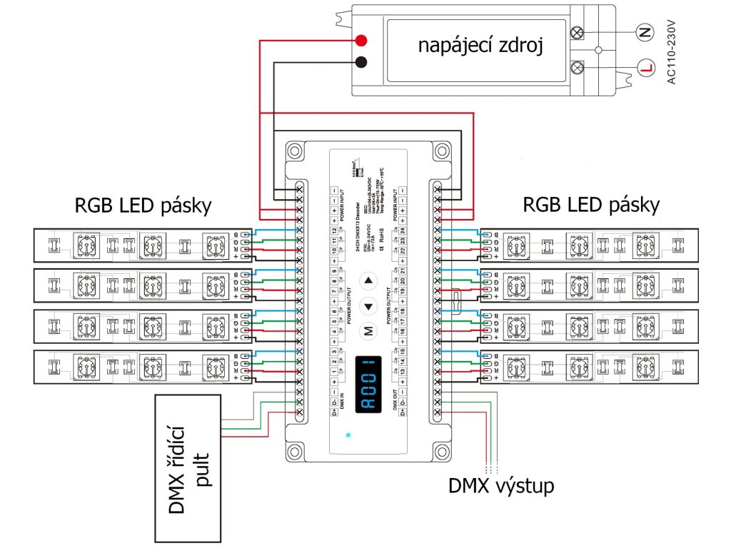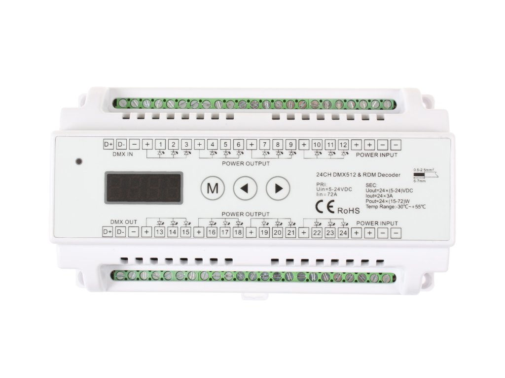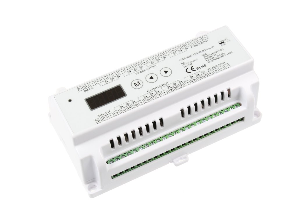 DMX512 24CH je 24-kanálový převodník určený pro ovládání LED systémů se společnou anodou pomocí DMX konzole, mezi které patří například jednobarevné a RGB pásky. Specifikace: - řízení nezávisle 8xRGB nebo 24 jednotlivých kanálů - kompatibilní s DMX512, DMX512(1990), DMX512-A, RDM V1.0 (E1.20 - 2006 ESTA) - RDM obousměrná komunikace – nastavení DMX adresy z DMX řízení - u RGB 4 nezávislé módy, u 24 kanálů lze uložit 8 skupin jasu - nastavení PWM frekvence 500Hz nebo 2kHz - nastavení logaritmického nebo lineárního stmívání - možnost instalace na DIN lištu Vstupní napětí 5V-24V DC Výstupní proud 3A na kanál (pro větší výkon je potřeba použít zesilovač) Výstupní výkon 12V-36W na kanál 24V-72W na kanál Připojení šroubovací svorkovnice Stupeň krytí: IP20Doplňkové parametry