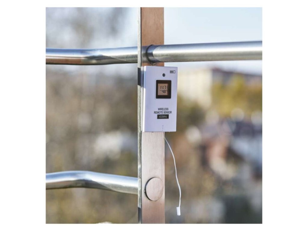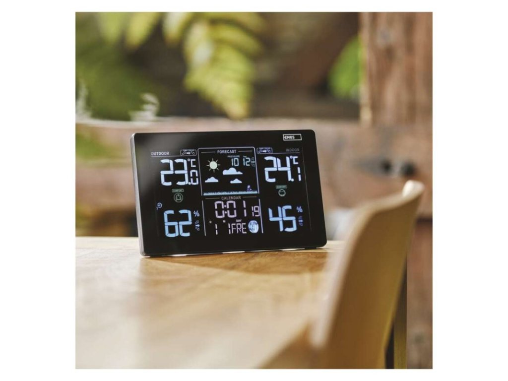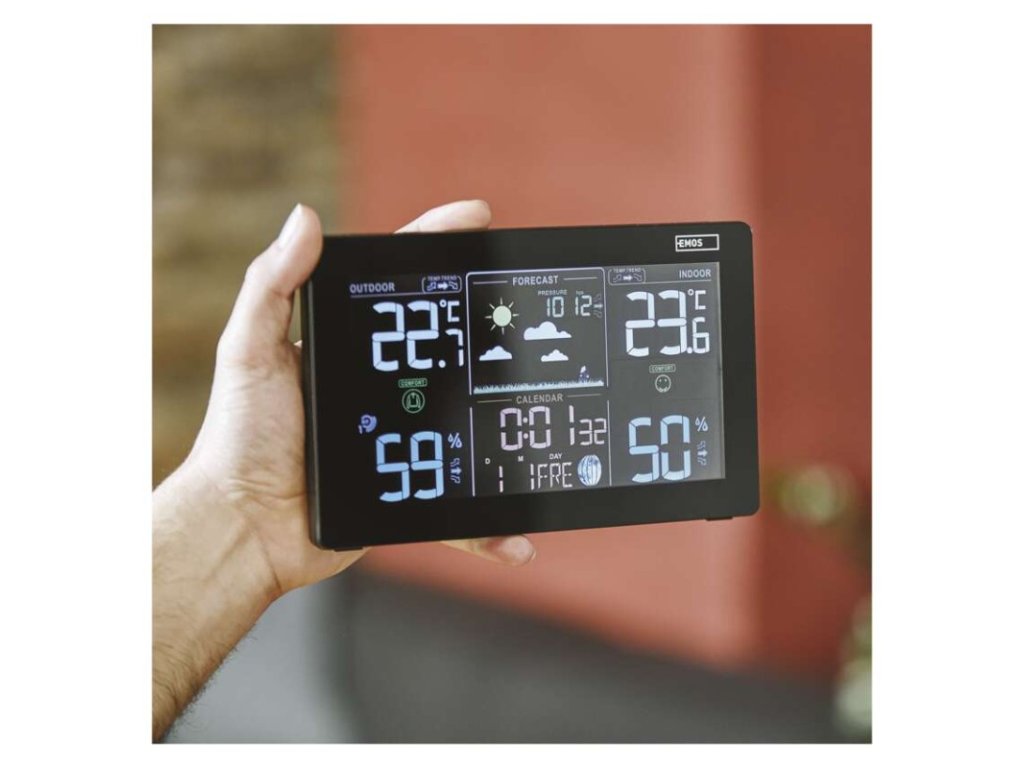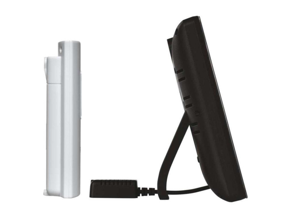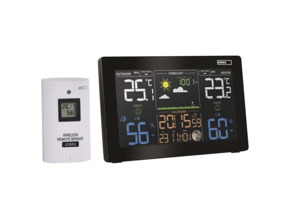 12/24 formát času: ano|anemometr: ne|barevný displej (black mask) podsvícený: ano|barometr: ano|budík: ano, 2×|časová pásma: ano|datum: ano|dosah čidla: až 50 m|drátová sonda k čidlu: 0,95 m|elektronické plošné podsvícení: ano|fáze měsíce: ano|hodiny: řízené DCF signálem|kalendář: ano|korekce nadmořské výšky: ne|LED podsvícení displeje: ano|min. a max. teplota: ano|možné další čidlo: až 3 čidla (E05018)|možnost nastavení jednotky teploty: °C/°F|možnost pověšení na zeď: ano|napájení čidla: 2× 1,5 V AAA (nejsou součástí balení)|napájení stanice: 3× 1,5 V AAA (nejsou součástí balení)|opakované buzení: ano|předpověď počasí: ano|přenosová frekvence: 433 MHz|prodejní obal: 1 ks, krabička|produkt: meteostanice|projekce: ne|provedení: bezdrátové|rozměr čidla: 21 × 60 × 100 mm|rozměr hlavní jednotky: 26 × 197 × 125 mm|síťový adaptér: ano, 5 V DC/600 mA (součástí balení)|srážkoměr: ne|teplotní výstraha: ne|trend teploty: ano|trend tlaku: ano|trvalé podsvícení: ano|velikost displeje: 164 × 90 mm|venkovní teplota: -40 °C až +70 °C, rozlišení 0,1 °C|venkovní vlhkost: 20 % až 95 % RV, rozlišení 1 %|vnitřní teplota: -10 °C až +50 °C, rozlišení 0,1 °C|vnitřní vlhkost: 1 % až 99 % RV, rozlišení 1 %Doplňkové parametry