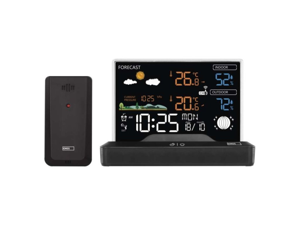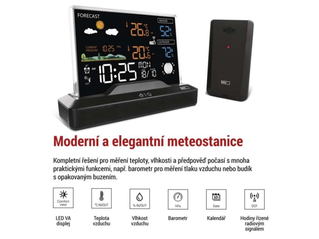 12/24 formát času: ano|anemometr: ne|barevný displej (black mask) podsvícený: ano|barometr: ano|budík: ano|časová pásma: ano|další funkce: –|datum: ano|dosah čidla: až 80 m|drátová sonda k čidlu: ne|elektronické plošné podsvícení: ano|fáze měsíce: ano|hodiny: řízené DCF signálem|kalendář: ano|kompatibilita: -|korekce nadmořské výšky: ne|LED podsvícení displeje: ano|min. a max. teplota: ano|možné další čidlo: až 3 čidla (E00387, E05018)|možnost nastavení jednotky teploty: °C/°F|možnost pověšení na zeď: ne|napájení čidla: 2× 1,5 V AAA (nejsou součástí balení)|napájení stanice: 2× 1,5 V AAA (nejsou součástí balení)|notifikace do mobilní aplikace: -|opakované buzení: ano|ovládání hlasovými asistenty: -|podporované OS: -|předpověď počasí: ano|přenosová frekvence: 433 MHz|prodejní obal: 1 ks, krabička|produkt: meteostanice|projekce: ne|protokol: -|provedení: bezdrátové|rozměr čidla: 50 × 25 × 95 mm|rozměr hlavní jednotky: 155 × 50 × 113 mm|síťový adaptér: ano, 5 V DC/1 000 mA (součástí balení)|srážkoměr: ne|teplotní výstraha: ne|trend teploty: ano|trend tlaku: ne|trvalé podsvícení: ano|velikost displeje: 127 × 85 mm|venkovní teplota: -40 °C až +70 °C, rozlišení 0,1 °C|venkovní vlhkost: 20 % až 99 % RV, rozlišení 1 %|vnitřní teplota: 0 °C až +50 °C, rozlišení 0,1 °C|vnitřní vlhkost: 20 % až 99 % RV, rozlišení 1 %Doplňkové parametry