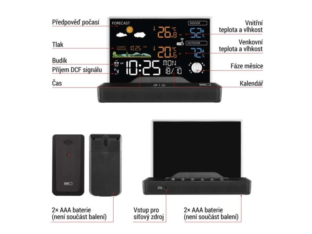 | Napájení stanice: | 2× 1,5 V AAA (nejsou součástí balení) |