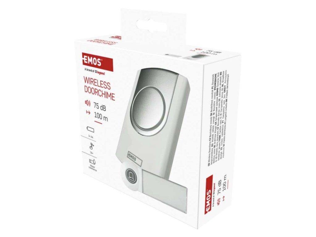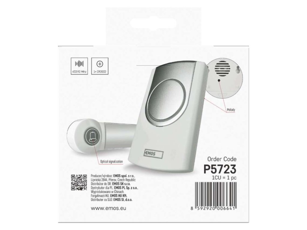 barva: bílá|dosah tlačítka: 100 m|maximální hlasitost zvonění: 75 dB|možnost přidat další tlačítko: ano, max. 8|napájení hlavní jednotky: 3× 1,5 V AA (nejsou součástí balení)|napájení tlačítka: 1× 3 V CR2032 (součástí balení)|optická signalizace na tlačítku: ano|optická signalizace na zvonku: ne|počet melodií: 36|počet přijímačů v balení: 1 ks|počet tlačítek v balení: 1 ks|přenosová frekvence: 433 MHz|přídavné (náhradní) tlačítko: P5723T|prodejní obal: 1 ks, blistr|regulace hlasitosti: ne|rozměr tlačítka: 23 × 93 × 34 mm|rozměr zvonku: 29 × 72 × 125 mm|speciální funkce: ne|voděodolné tlačítko: IP44|způsob párování: automatické párování–self-learning|způsob přenosu: bezdrátový zvonekDoplňkové parametry
