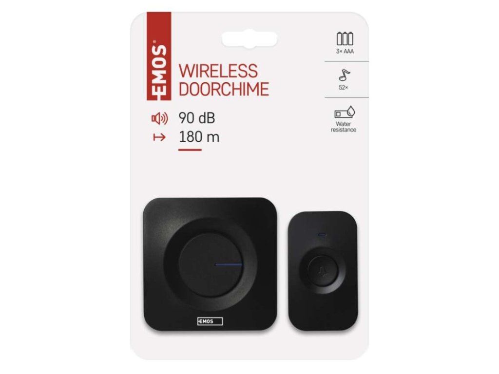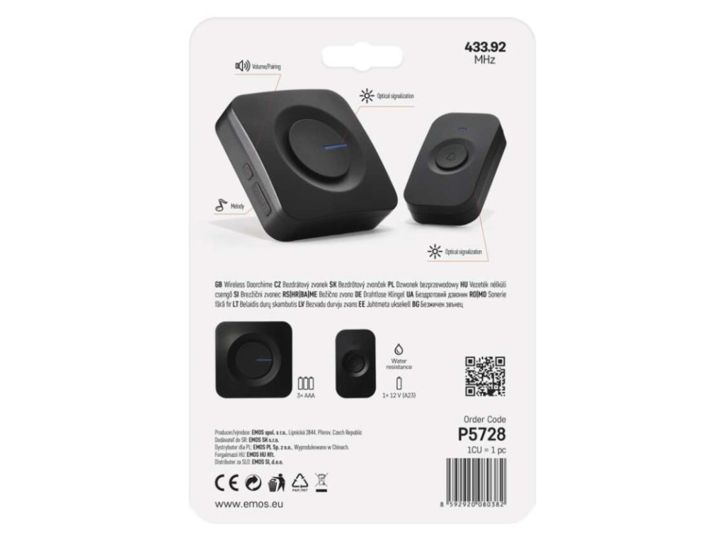 barva: černá|dosah tlačítka: 180 m|maximální hlasitost zvonění: 90 dB|možnost přidat další tlačítko: ano, max. 6|napájení hlavní jednotky: 3× 1,5 V AAA (nejsou součástí balení)|napájení tlačítka: 1× 12 V A23 (součástí balení)|optická signalizace na tlačítku: ano|optická signalizace na zvonku: ano|počet melodií: 52|počet přijímačů v balení: 1 ks|počet tlačítek v balení: 1 ks|přenosová frekvence: 433 MHz|přídavné (náhradní) tlačítko: P5728T|prodejní obal: 1 ks, blistr|regulace hlasitosti: ano, 5 úrovní|rozměr tlačítka: 19 × 42 × 72 mm|rozměr zvonku: 26 × 81 × 81 mm|speciální funkce: ne|voděodolné tlačítko: IP56|způsob párování: automatické párování–self-learning|způsob přenosu: bezdrátový zvonekDoplňkové parametry