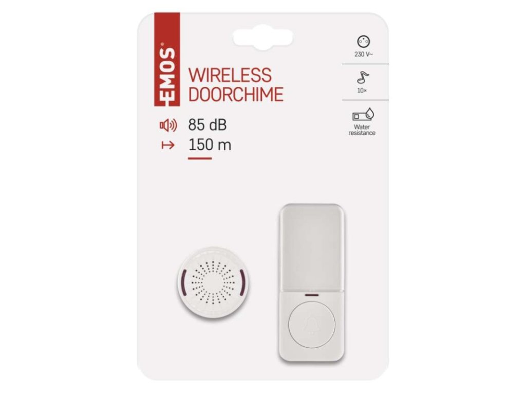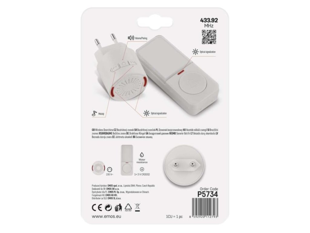 barva: bílá|dosah tlačítka: 150 m|maximální hlasitost zvonění: 85 dB|možnost přidat další tlačítko: ano, max. 8|napájení hlavní jednotky: 230 V AC|napájení tlačítka: 1× 3 V CR2032 (součástí balení)|optická signalizace na tlačítku: ano|optická signalizace na zvonku: ano|počet melodií: 10|počet přijímačů v balení: 1 ks|počet tlačítek v balení: 1 ks|přenosová frekvence: 433 MHz|přídavné (náhradní) tlačítko: P5734T|prodejní obal: 1 ks, blistr|regulace hlasitosti: ano, 5 úrovní|rozměr tlačítka: 19 × 38 × 92 mm|rozměr zvonku: 72 × 42 × 42 mm|speciální funkce: ne|voděodolné tlačítko: IP56|způsob párování: automatické párování–self-learning|způsob přenosu: bezdrátový zvonekDoplňkové parametry