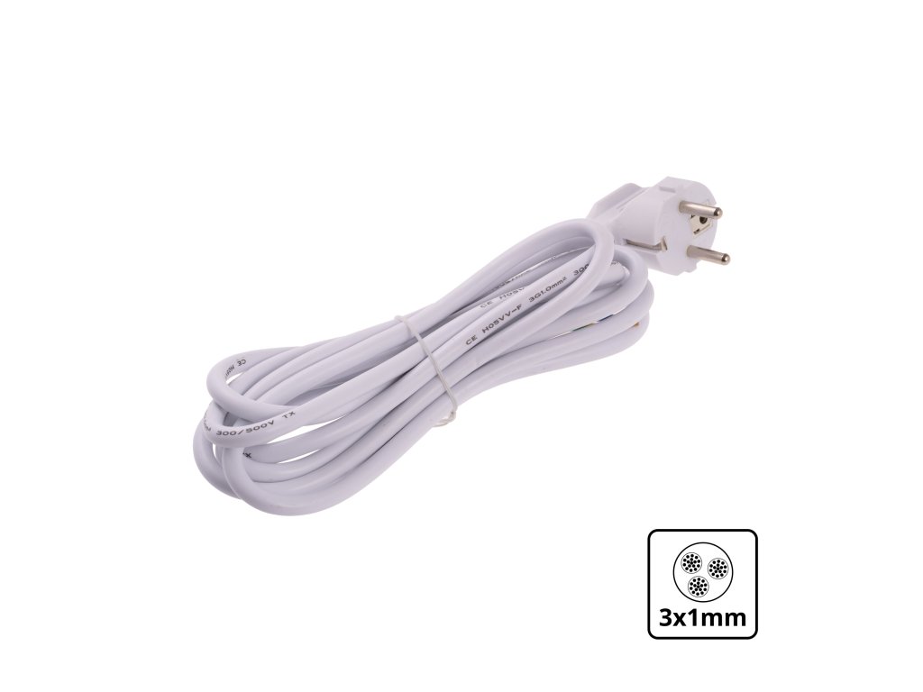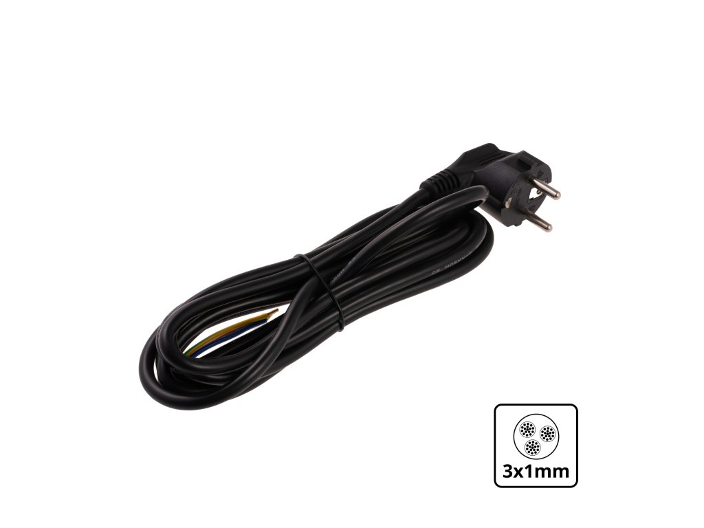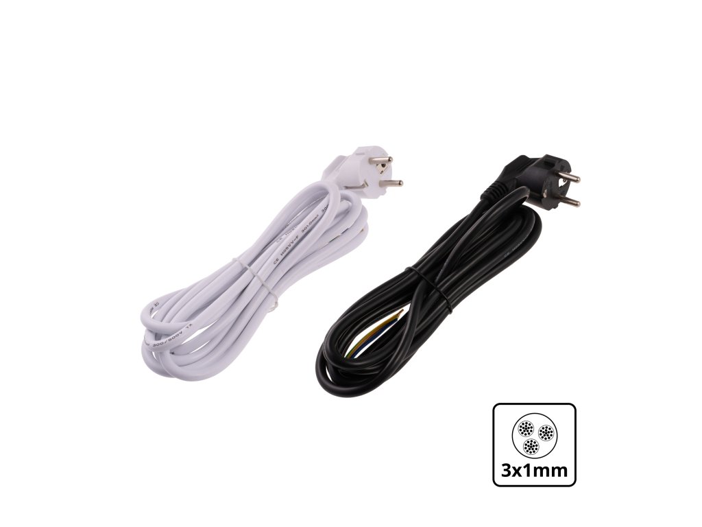 Specifikace kabelu Průřez 3x1mm2 3x1mm2 Barva černá bílá Délka 3m Napájecí napětí max. 250V Maximální proud 10A Typ izolace PVC Vodič H05VV-FDoplňkové parametry