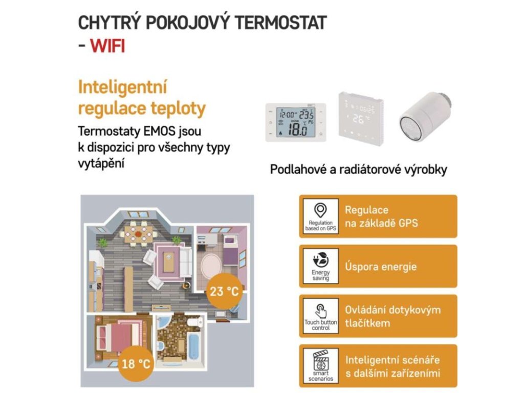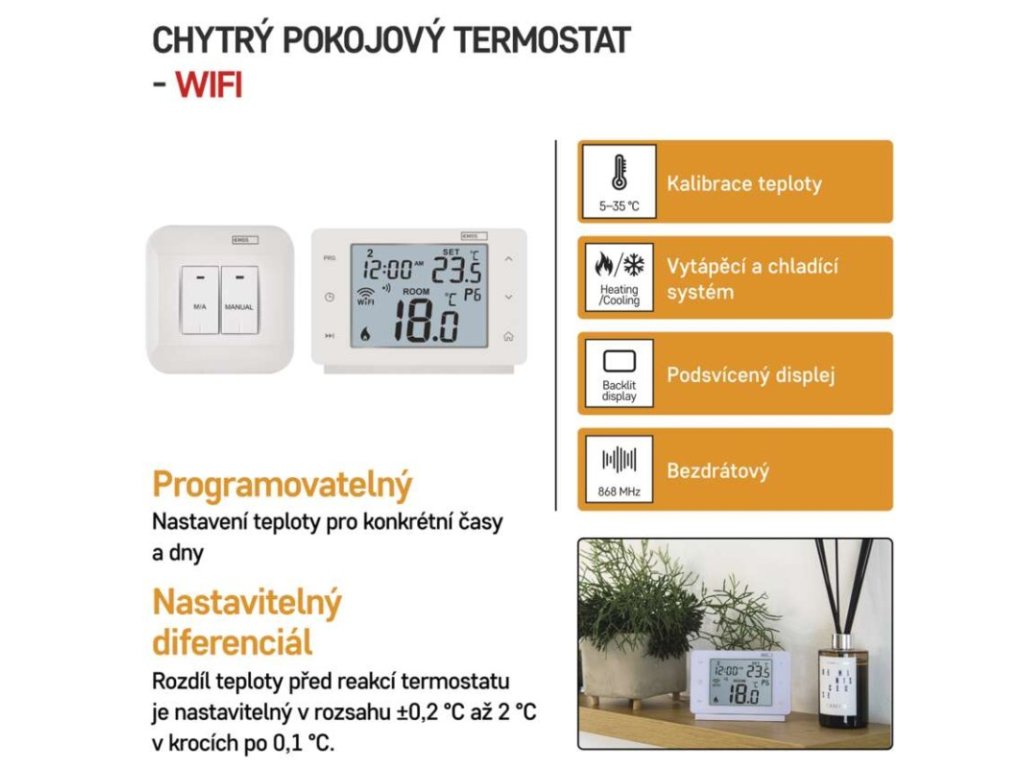barva: bílá|délka kapilárového čidla: neuvádí se|dosah ve volném prostoru: 100 m|druh regulace: vytápěcí a chladící systém|funkce ON/OFF: ano|funkce prázdniny: ano|funkce Set-back: ne|jazyky aplikace: EN, CZ, SK, PL, DE, HU, SI, FR, + 60 dalších jazyků|kalibrace teploty: ano|kompatibilita: EMOS GoSmart, TUYA, LIDL, Smartlife, Otevřený systém|měření teploty: 0 °C až 40 °C, rozlišení 0,1 °C|možnost propojení s dalšími detektory: neuvádí se|napájení: neuvádí se|napájení brány: neuvádí se|napájení přijímače: 230 V AC|napájení vysílače: 5 V USB adaptér (součástí dodávky)|nastavení teploty: 5 °C až 35 °C, po 0,5 °C|nastavitelný rozptyl teploty: 0,2 °C až 2 °C (rozlišení 0,1 °C)|notifikace do mobilní aplikace: ano|ochrana proti zamrznutí: ano|ovládání hlasovými asistenty: ano (Amazon Alexa, Google Assistant)|počet programů: uživatelsky nastavitelná teplota (6× za den)|podporované OS: Android, iOS|podsvícený displej: ano|pracovní frekvence: 868 MHz|přenosová frekvence: 2,4 GHz WIFI (IEEE802.11b/g/n)|prodejní obal: 1 ks, krabička|protokol: Wi-Fi|rozměr: neuvádí se|rozměr brány: neuvádí se|rozměr přijímače: 37 × 86 × 86 mm|rozměr vysílače: 40 × 138 × 96 mm|součást balení: neuvádí se|spínaná zátěž: 16 A odporově, 4 A induktivně|spínání: 230 V AC nebo beznapěťové|typ nastavení teploty: 6 teplotních změn denně|typ ovládání: programovatelný elektronický pokojový termostat, možnost ovládaní přes mobil (iOS, Android)|typ termostatu: bezdrátovýDoplňkové parametry