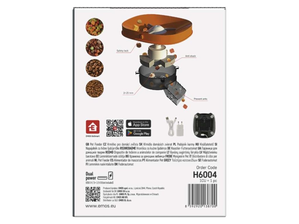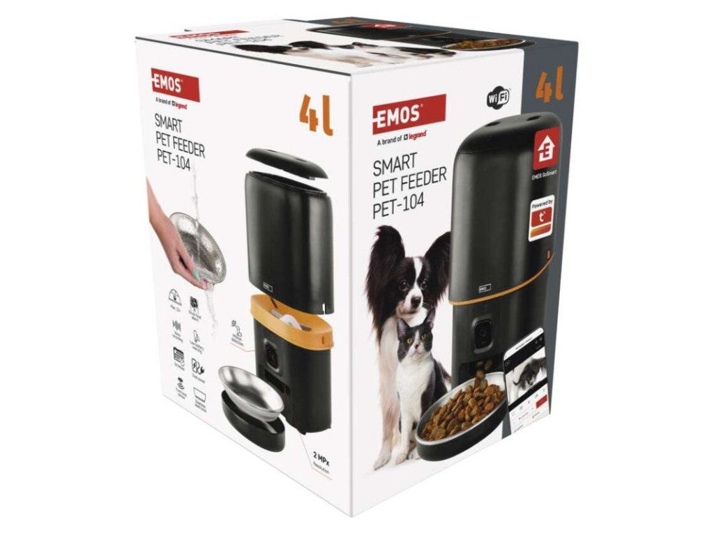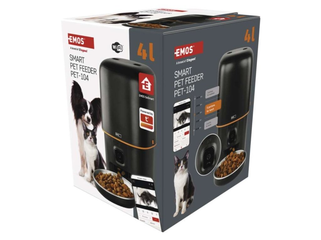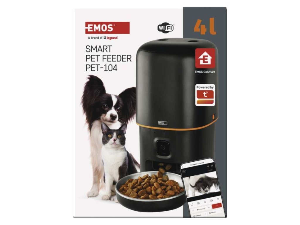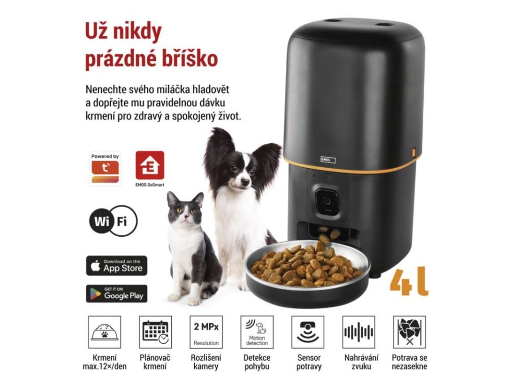 barva: černá|další funkce: vyjímatelná nerezová miska, polohovatelná kamera|detekce pohybu: ano|detekce zvuku: ne|doporučení: malá a střední plemena|funkce WebRTC: ano|hlasová komunikace: ano, obousměrná (Full-Duplex)|instalační materiál: –|IR CUT: ano|jazyky aplikace: EN, CZ, SK, PL, DE, HU, SI, FR, + 60 dalších jazyků|jedna porce: 5 g|kapacita: 4 l|kompatibilita: EMOS GoSmart, TUYA, LIDL, Smartlife, Otevřený systém|maximální úhel záběru kamery: 118°|napájení: 5 V/1 A / 3× 1,5 V typ D|noční vidění: ano, max. 5 m|notifikace do mobilní aplikace: ano|obsah balení: krmítko, napájecí adaptér, přívodní kabel|ovládání hlasovými asistenty: –|podporované OS: Android, iOS|přenosová frekvence: 2,4 GHz|prodejní obal: 1 ks, krabice|protokol: Wi-Fi|průměr granulí: 2–15 mm|řada: GoSmart|rozlišení kamery: 1 920 × 1 080|rozměr: 315 × 314 × 168 mm|typ produktu: chytré krmítko s kamerou|ukládání na cloud: ne|ukládání na SD kartu: ne|určení: vnitřní|vyvolání hovoru tlačítkem: ne|záruční doba: 2 roky|zdroj součástí balení: anoDoplňkové parametry