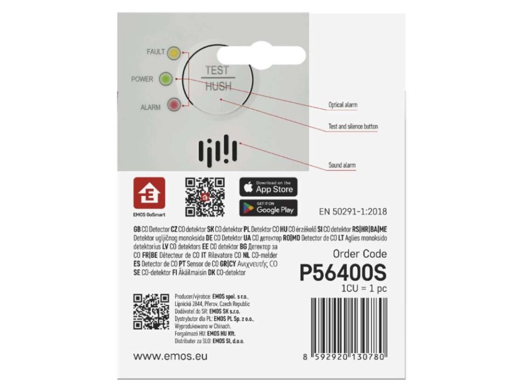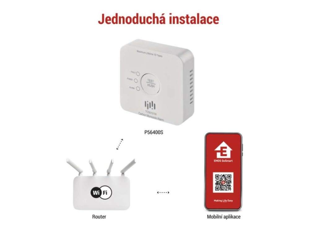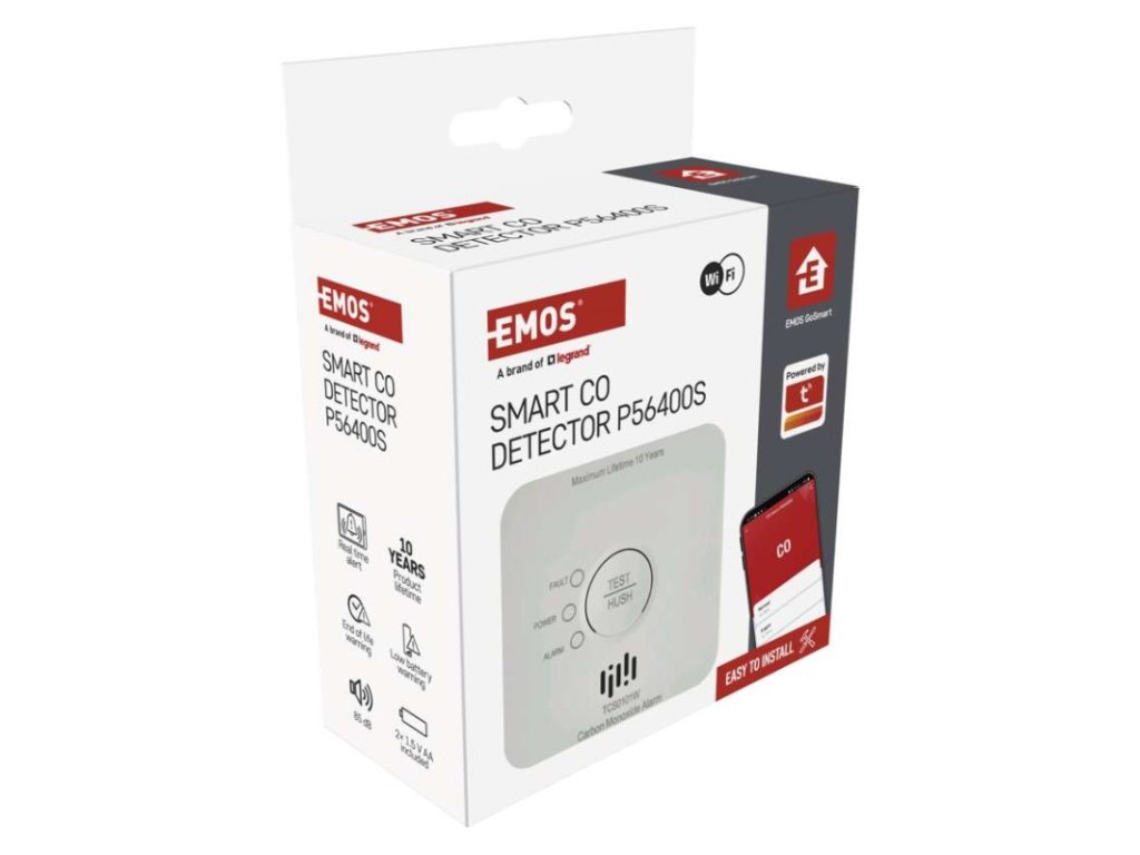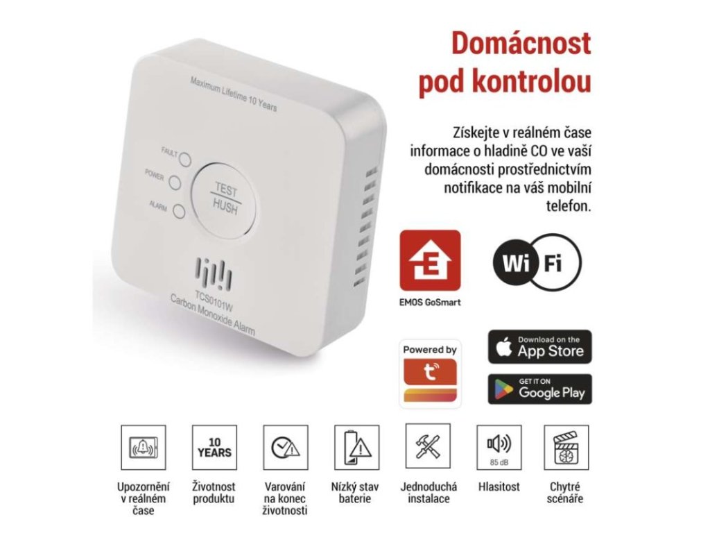další funkce: –|dosah modulu: neuvádí se|hlasitost signalizace: >85 dB ve vzdálenosti 3 m|jazyky aplikace: EN, CZ, SK, PL, DE, HU, SI, FR, + 60 dalších jazyků|kompatibilita: EMOS GoSmart, TUYA, LIDL, Smartlife, Otevřený systém|krytí: IP30|možnost propojení s dalšími detektory: neuvádí se|napájení: 2× 1,5 V AA, součástí balení|notifikace do mobilní aplikace: ano|ovládání hlasovými asistenty: ne|paměť poplachů: ano|podporované OS: Android, iOS|poplachová teplota: –|přenosová frekvence: 2,4 GHz Wi-Fi|prodejní obal: 1 ks, krabička|protokol: Wi-Fi|provozní teplota: -10 °C až 40 °C|provozní vlhkost: 15–93 %|rozměr: 93 × 30 × 93 mm|typ detekce: detektor CO|typ instalace: montáž na zeď nebo volně stojící|typ signalizace: optická i zvuková|určeno pro typ: neuvádí se|životnost: 10 letDoplňkové parametry