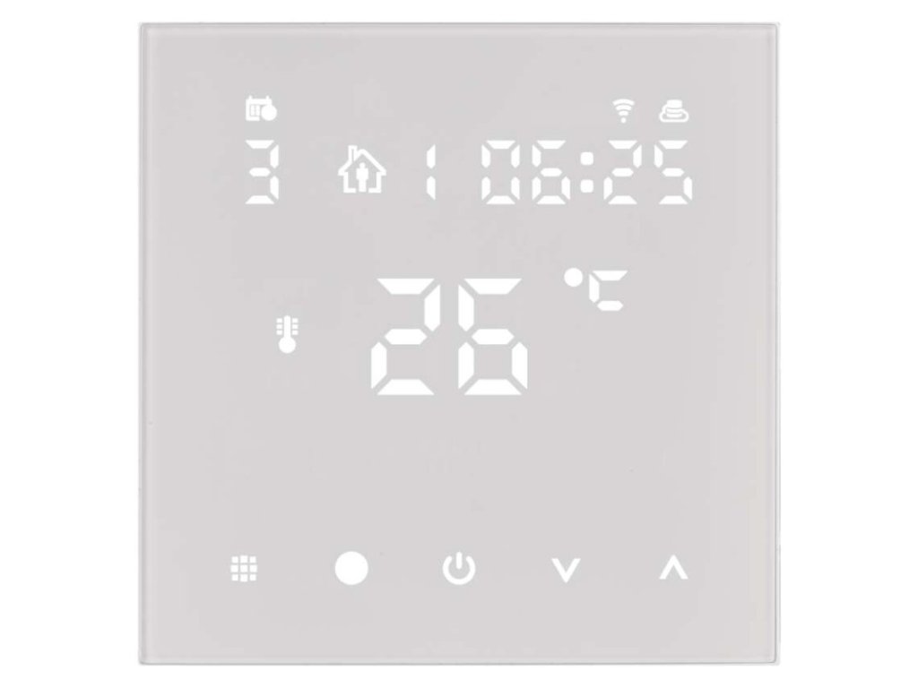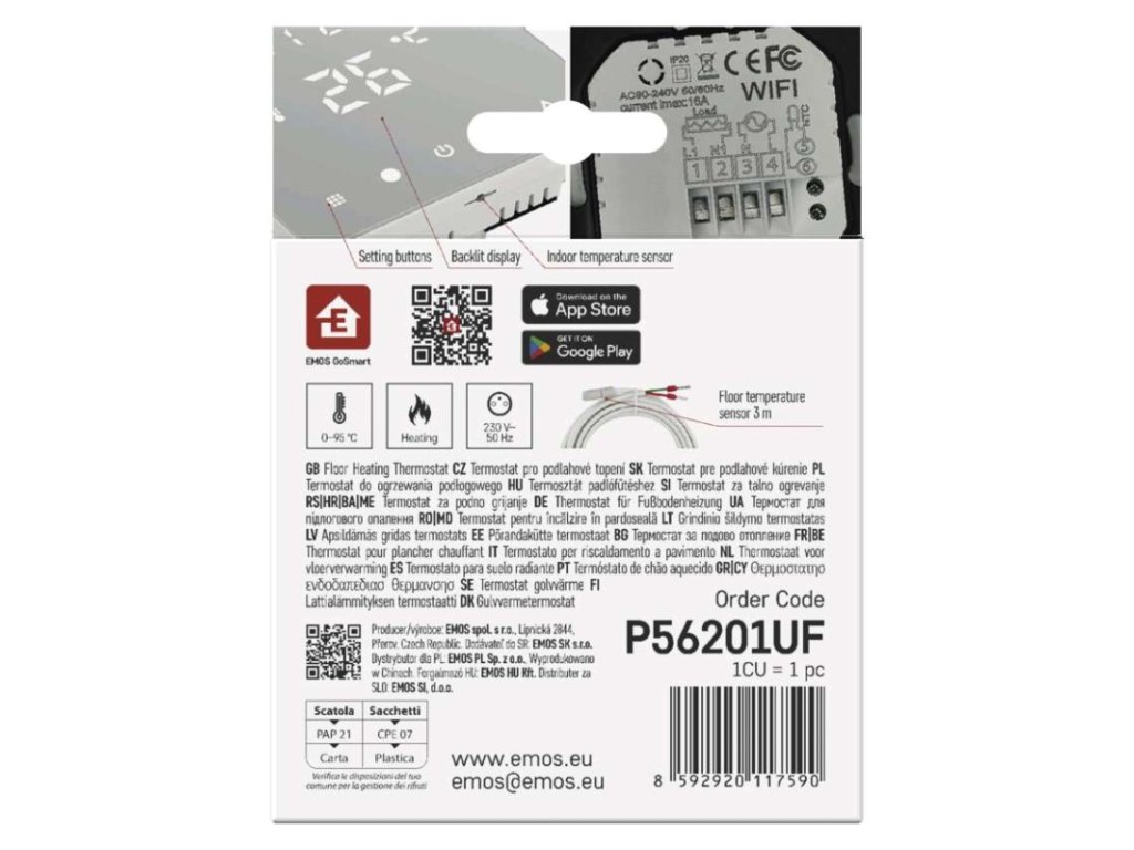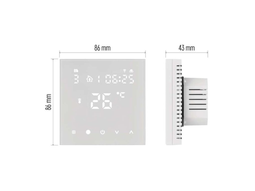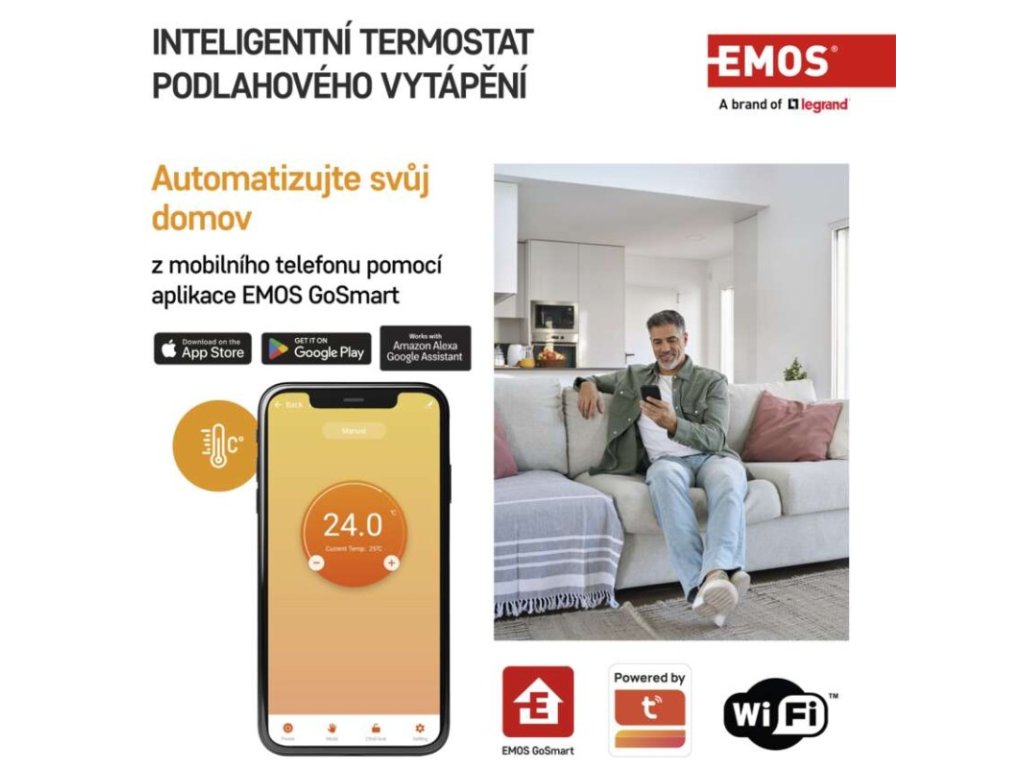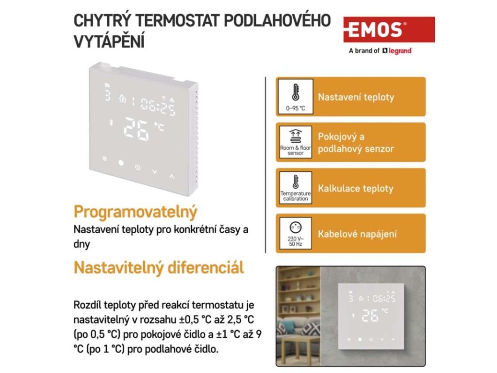barva: bílá|délka kapilárového čidla: neuvádí se|dosah ve volném prostoru: neuvádí se|druh regulace: vytápěcí systém|funkce ON/OFF: ano|funkce prázdniny: ano|funkce Set-back: ne|jazyky aplikace: EN, CZ, SK, PL, DE, HU, SI, FR, + 60 dalších jazyků|kalibrace teploty: ano|kompatibilita: EMOS GoSmart, TUYA, LIDL, Smartlife, Otevřený systém|měření teploty: 0 °C až 95 °C, rozlišení 0,5 °C|možnost propojení s dalšími detektory: neuvádí se|napájení: 230 V AC|napájení brány: neuvádí se|napájení přijímače: neuvádí se|napájení vysílače: neuvádí se|nastavení teploty: 1 °C až 70 °C, po 0,5 °C|nastavitelný rozptyl teploty: vnitřní čidlo: 0,5 °C až 2,5 °C, rozlišení 0,5 °C; podlahové čidlo: 1 °C až 9 °C, rozlišení 1 °C|notifikace do mobilní aplikace: ano|ochrana proti zamrznutí: ano|ovládání hlasovými asistenty: ano (Amazon Alexa, Google Assistant)|počet programů: uživatelsky nastavitelná teplota (6× za den)|podlahové čidlo: NTC 10 kΩ, 3 m|podporované OS: Android, iOS|podsvícený displej: ano|pracovní frekvence: neuvádí se|přenosová frekvence: 2,4 GHz WIFI (IEEE802.11b/g/n)|prodejní obal: 1 ks, krabička|protokol: Wi-Fi|rozměr: 86 × 86 × 43 mm|rozměr brány: neuvádí se|rozměr přijímače: neuvádí se|rozměr vysílače: neuvádí se|součást balení: termostat, podlahové čidlo 3 m, Ø 8 mm|spínaná zátěž: 16 A odporově|spínání: napěťové 230 V AC, 50 Hz|typ nastavení teploty: 6 teplotních změn denně|typ ovládání: programovatelný elektronický pokojový termostat, možnost ovládaní přes mobil (iOS, Android)|typ termostatu: drátový pro podlahové vytápění, podomítkovýDoplňkové parametry