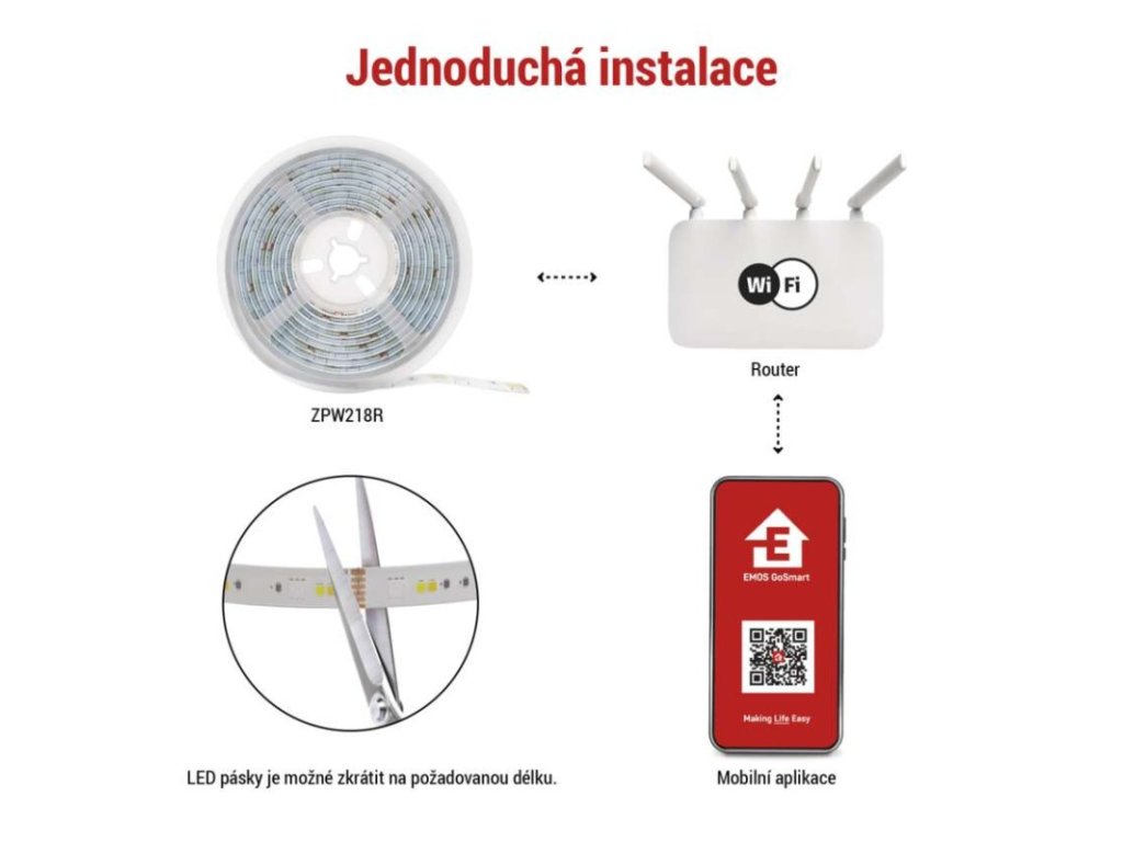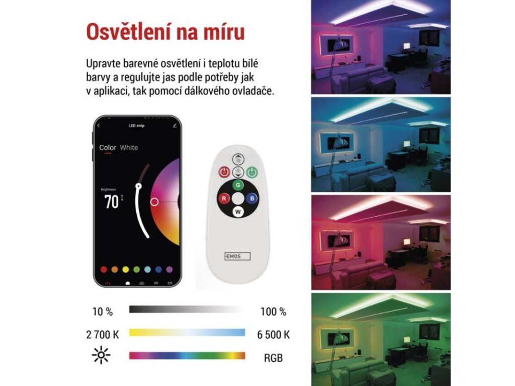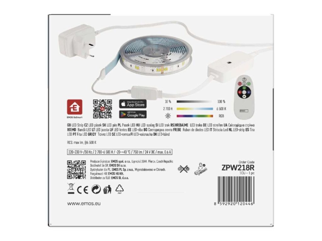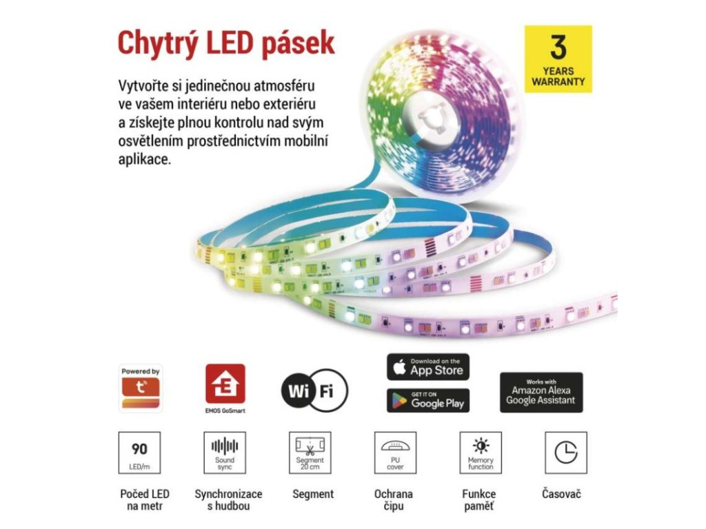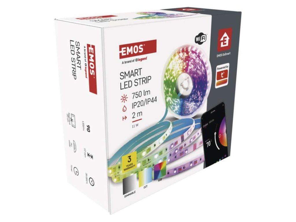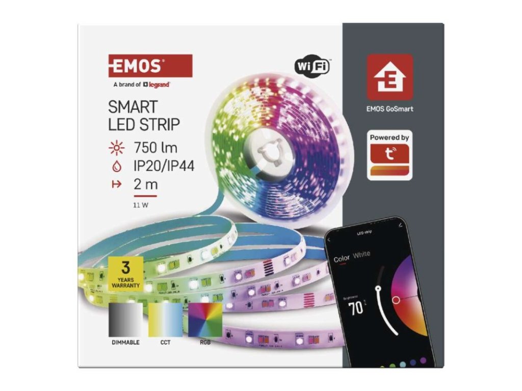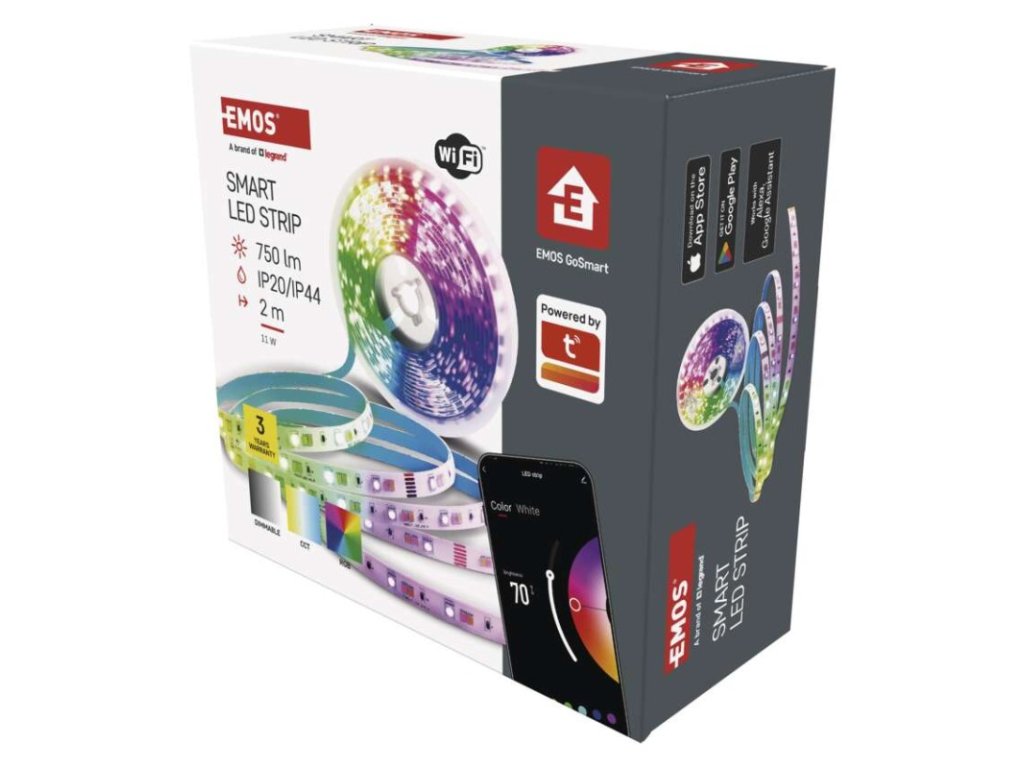 barva světla: teplá bílá–studená bílá|barva těla: –|délka: 2 m|délka přívodu: 1,5 m|energetická třída obsaženého světelného zdroje: G|jazyky aplikace: EN, CZ, SK, PL, DE, HU, SI, FR, + 60 dalších jazyků|kategorie: GoSmart|kompatibilita: EMOS GoSmart, Tuya, Lidl, Smartlife|krytí: IP20/IP44|materiál difuzoru: PU|materiál těla: –|maximální počet segmentů: 10|nastavení barev (RGB): ano|nastavení teploty chromatičnosti: ano|notifikace do mobilní aplikace: ano|obsažený světelný zdroj: ZPW218R.LS|ovládání hlasovými asistenty: ano (Amazon Alexa, Google Assistant)|počet segmentů: 10|počet spínacích cyklů: 20 000|podporované OS: iOS, Android|přenosová frekvence: 2,4 GHz (IEEE 802.11b/g/n)|příkon: 11 W|prodejní obal: 1 ks, krabička|protokol: WIFI + BLE|řada: –|RGB digital: ne|šířka: 12 mm|stmívání: ano|světelná účinnost: 63 lm/W|světelný tok: 750 lm|technologie: LED|teplota chromatičnosti: 2 700–6 500 K|tvar: –|vstupní napětí: 230 V~/50 Hz|výška: 2 mm|záruční doba: 3 roky|životnost: 20 000 hodinDoplňkové parametry