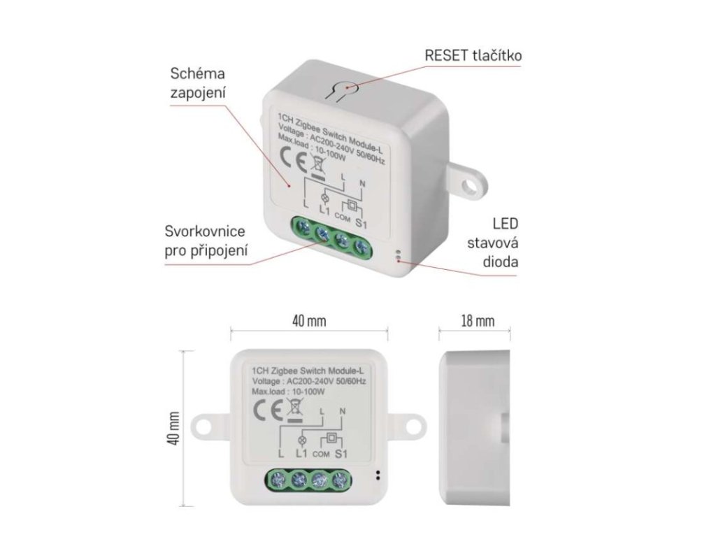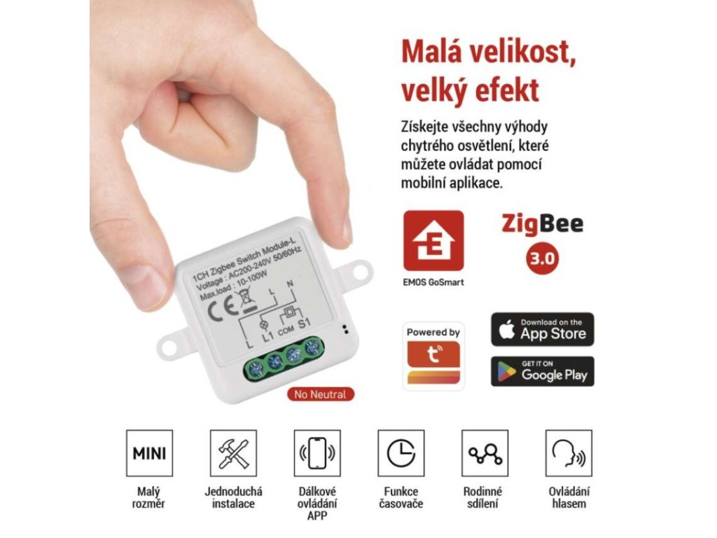 hloubka: 18 mm|hmotnost: 30 g|jazyky aplikace: EN, CZ, SK, PL, DE, HU, SI, FR, + 60 dalších jazyků|kompatibilita: EMOS GoSmart, TUYA, LIDL, Smartlife, Otevřený systém|maximální počet připojených klientů: –|napájení: 230 V~/50 Hz, max. 0,3 W|ovládání hlasovými asistenty: ano (Amazon Alexa, Google Assistant)|párování: automatické, manuální|počet ovládacích tlačítek: 1|podporované OS: Android, iOS|použití: vnitřní|přenosová frekvence: 2,4 GHz (IEEE 802.15.4)|prodejní obal: 1 ks, papírová krabička|protokol: Zigbee 3.0|šířka: 40 mm|typ produktu: IP spínací modul|výška: 40 mm|zdroj součástí balení: –Doplňkové parametry