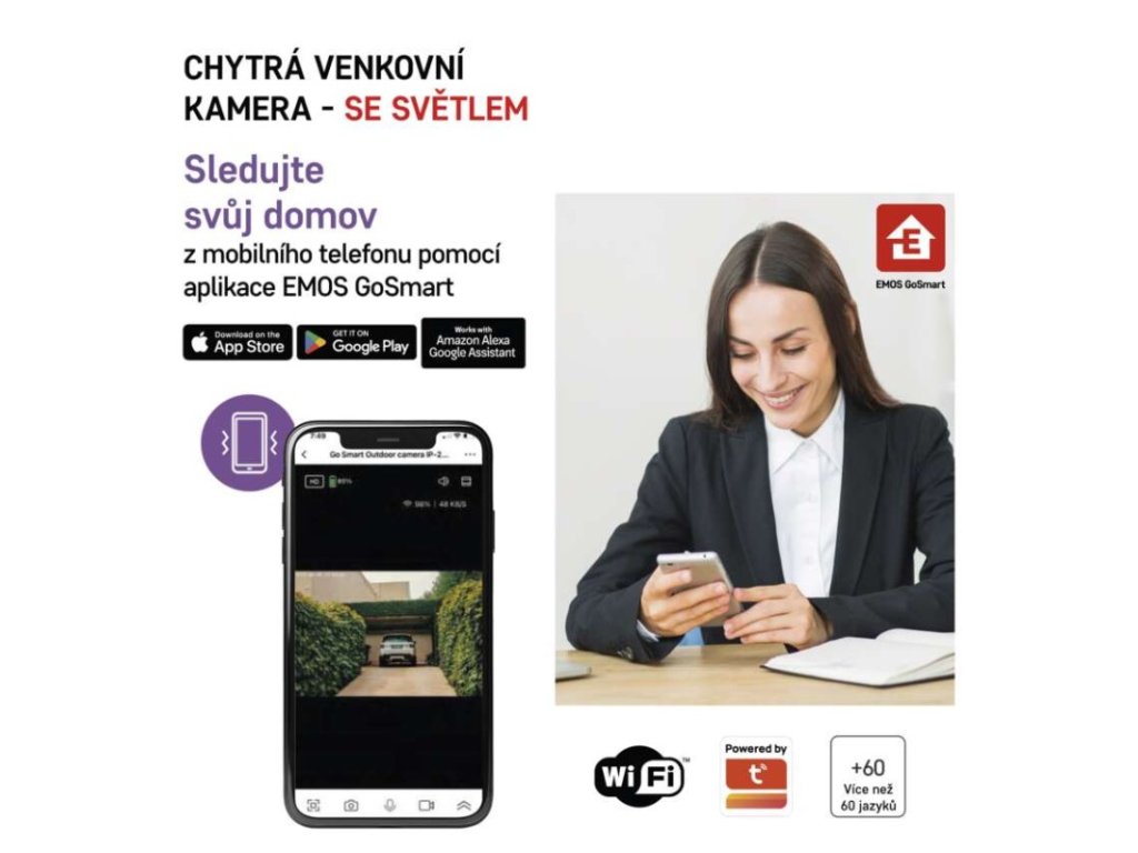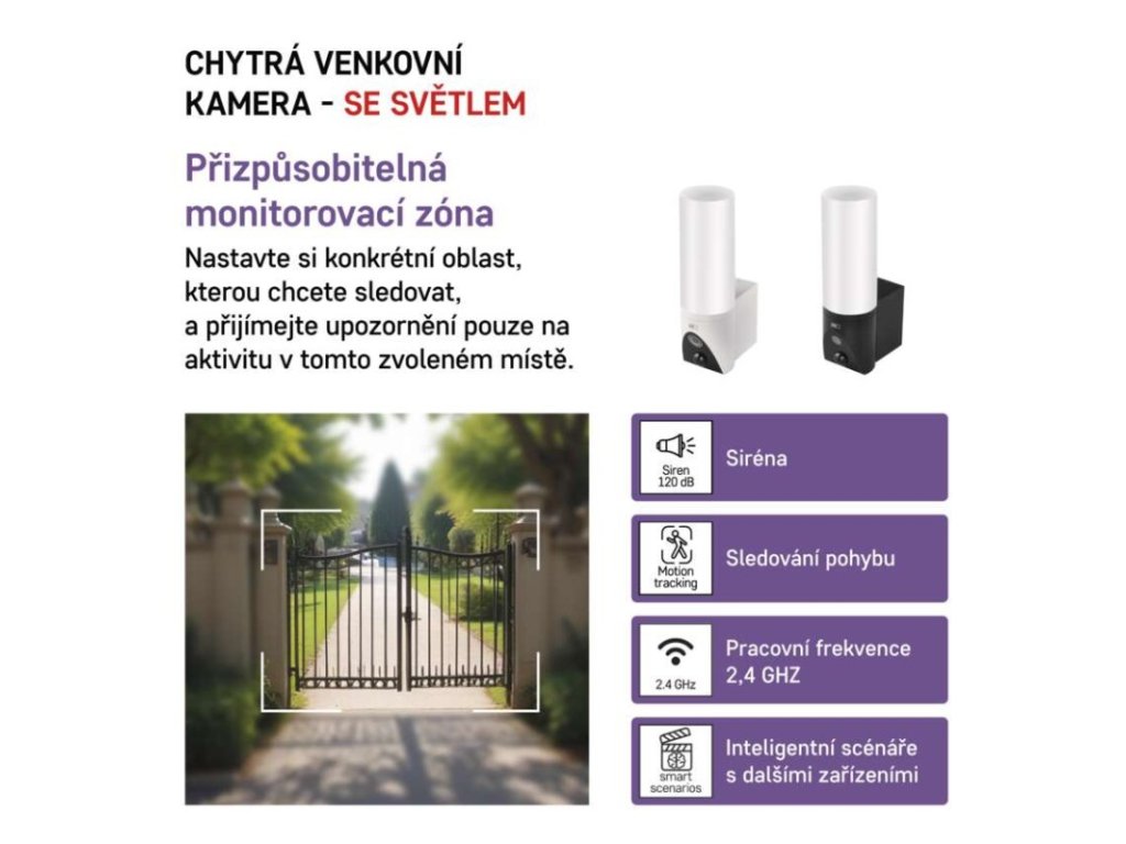 automatické ukládání snímků: ano|barva: černá|další funkce: –|detekce pohybu: ano|detekce zvuku: ne|dosah detekce pohybu: 10 metrů|funkce WebRTC: ano|hlasová komunikace: obousměrná|hloubka: 131 mm|instalační materiál: ano|IR CUT: ne|jazyky aplikace: EN, CZ, SK, PL, DE, HU, SI, FR, + 60 dalších jazyků|kompatibilita: EMOS GoSmart, TUYA, LIDL, Smartlife, Otevřený systém|krytí: IP65|maximální dosvit nočního vidění: 10 metrů|maximální úhel záběru kamery: 130°|montáž: na stěnu|motorizované otáčení: ano|napájení kamery: AC 100~240 V|nastavení oblasti detekce: ano|noční vidění: ano, 4× IR LED + bílá LED|notifikace do mobilní aplikace: ano|obsah balení: 1× kamerová jednotka, 1× instalační materiál, 1× manuál|ochrana proti odcizení: blokováno aplikací|ovládání hlasovými asistenty: ano (Amazon Alexa, Google Assistant)|podpora ONVIF: ano|podporované OS: Android, iOS|přenosová frekvence: 2,4 GHz WIFI|přídavné LED světlo: ano|přídavný vnitřní monitor: ne|prodejní obal: 1 ks, krabice|protokol: Wi-Fi|řada: GoSmart|rozlišení kamery: 2 304 × 1 296|rozpoznání lidského těla: ne|rozpoznání zvířete: ne|siréna: ano|šířka: 74 mm|sledování pohybu (tracking): ano|snímací prvek kamery: 1/2.8‘‘ 3 Megapixel CMOS|soukromý (privátní) mód: ne|typ držáku: základní|typ produktu: IP kamera|úhel detekce pohybu: 120°|ukládání na cloud: ano|ukládání na SD kartu: ano|výdrž baterie: –|výška: 260 mm|vyvolání hovoru tlačítkem: ne|záruční doba: 2 roky|zdroj součástí balení: neDoplňkové parametry