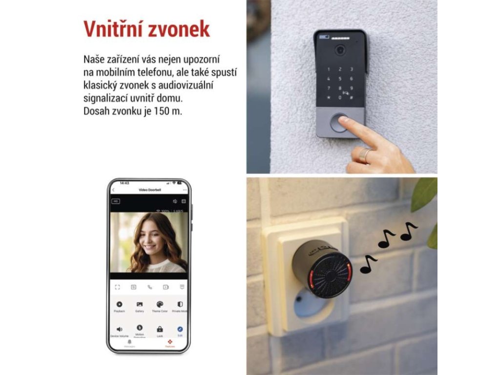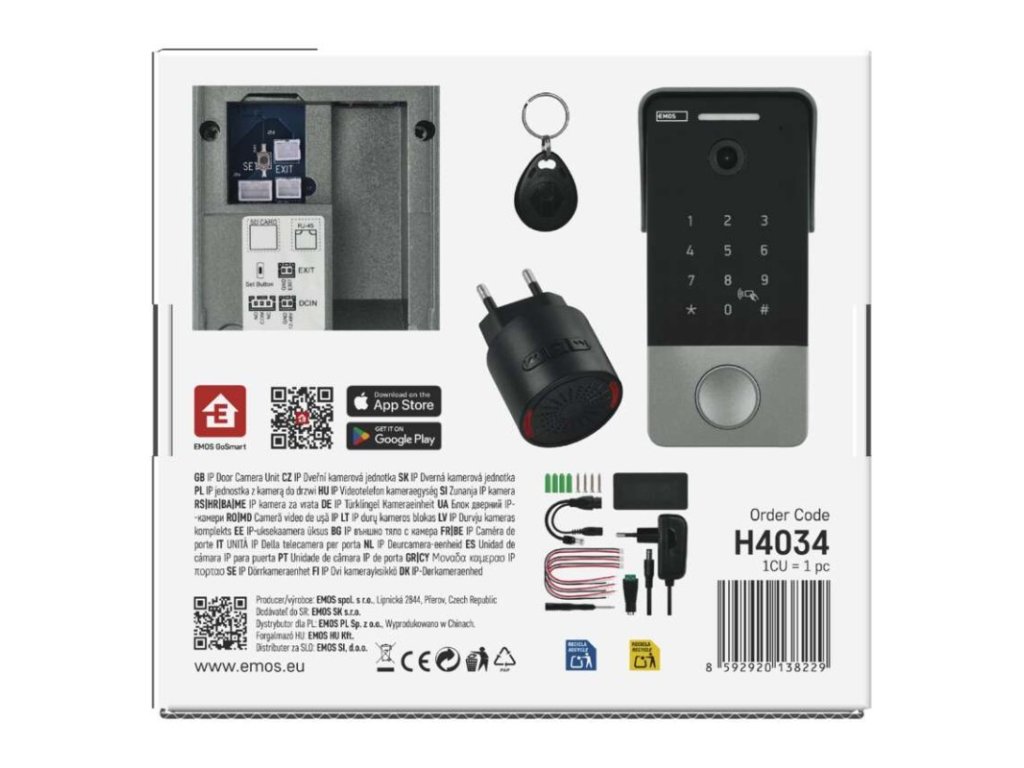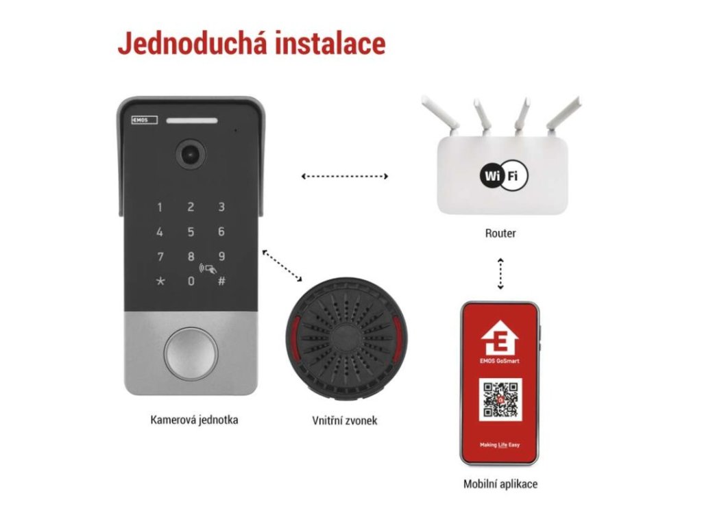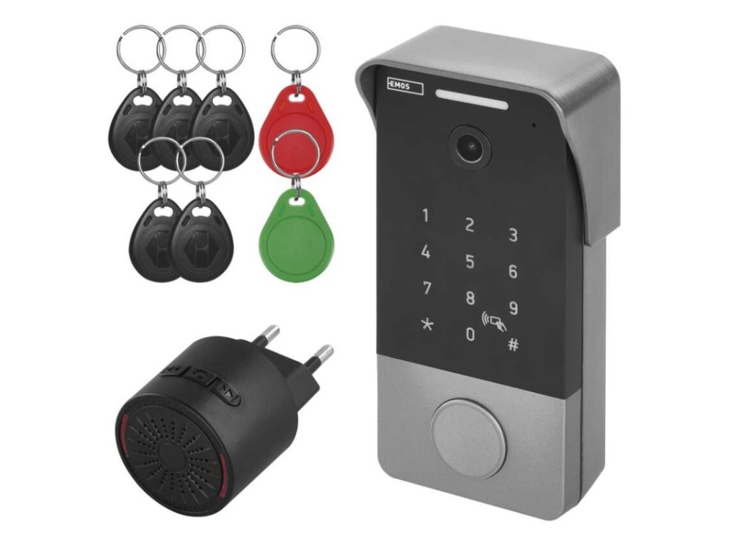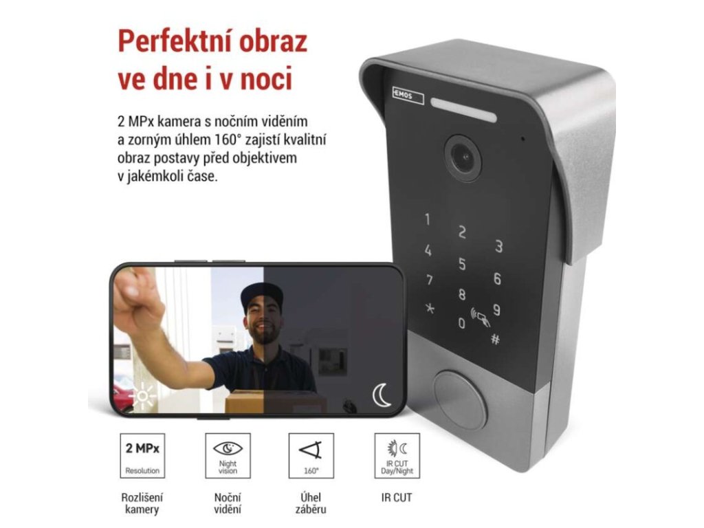 antivandal provedení kamerové jednotky: ano|automatické ukládání snímků: ano|barva: šedá|další funkce: –|detekce pohybu: ano|doporučená kabeláž: UTP / FTP kabel (RJ45)|Funkce WebRTC: ano|hlasová komunikace: obousměrná|IR CUT: ano|jazyky aplikace: EN, CZ, SK, PL, DE, HU, SI, FR, + 60 dalších jazyků|kompatibilita: EMOS GoSmart, TUYA, LIDL, Smartlife, Otevřený systém|krytí kamerové jednotky: IP44|maximální dosvit nočního vidění: 10 metrů|maximální úhel záběru kamery: 160°|montáž: na stěnu|možnost připojení přídavných kamer: ne|napájení kamerové jednotky: 12-48V DC / PoE|napájení vnitřního zvonku: 230V AC|noční vidění: ano|notifikace do mobilní aplikace: ano|obsah balení: 1× videozvonek, 1× vnitřní gong, 1× napájecí adaptér, 1× napájecí redukce, 1× PoE injektor, 1× montážní sada, 7× RFID klíčenka|ochrana proti odcizení: ano|ovládání hlasovými asistenty: –|ovládání pojezdu brány: ne|ovládání zámků: ano|počet melodií vnitřního zvonku: 10|počet tlačítek kamerové jednotky: 1|podporované OS: Android, iOS|přenosová frekvence: 2,4 GHz WIFI|přídávný vnitřní zvonek: ano|prodejní obal: 1 ks, krabice|protokol: Wi-Fi|regulace hlasitosti: ano|rozlišení kamery: 1 920 × 1 080|rozměr kamerové jednotky: 140 × 69 × 38 mm|siréna: ne|snímací prvek kamery: 1/2,9" CMOS GC2053|typ produktu: videozvonek|ukládání na cloud: ano|ukládání na SD kartu: ano|záruční doba: 2 roky|zdroj součástí balení: anoDoplňkové parametry