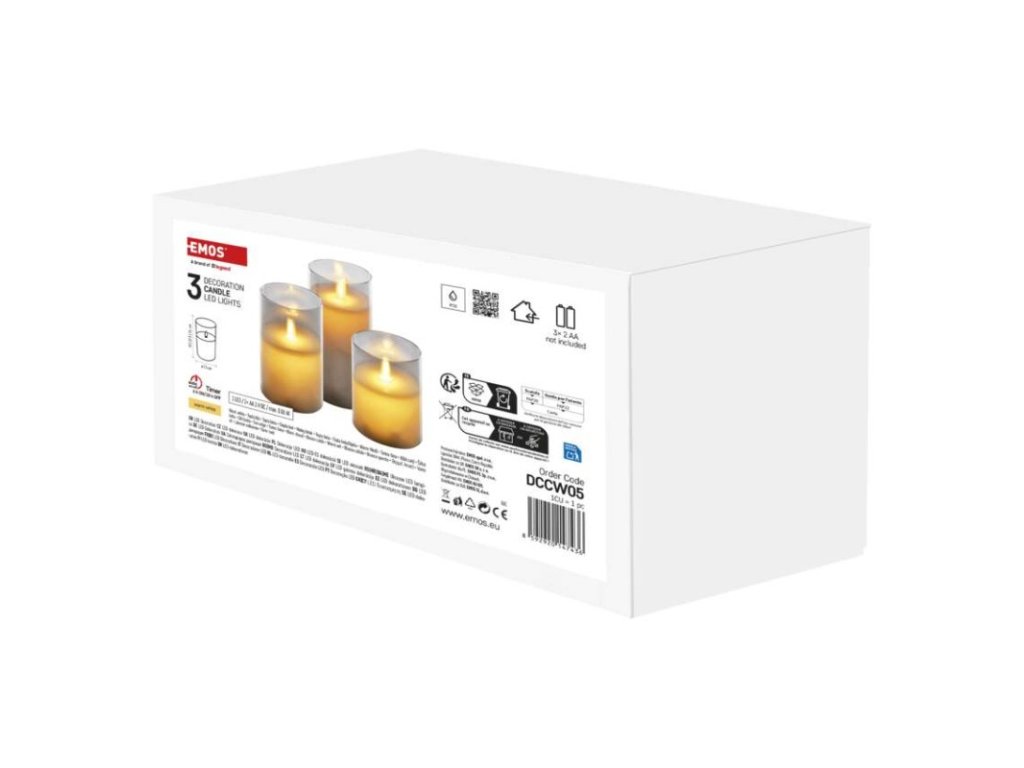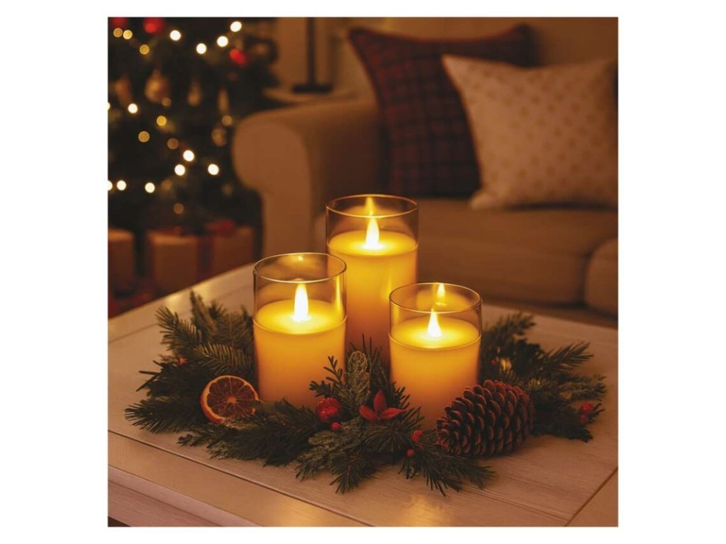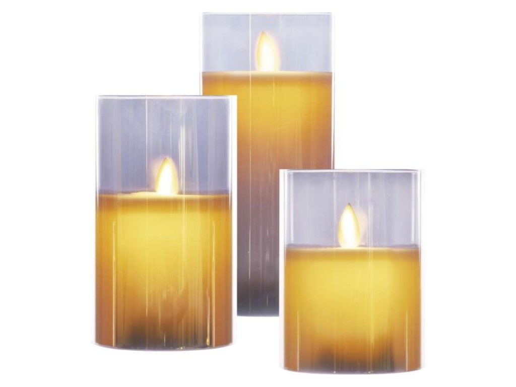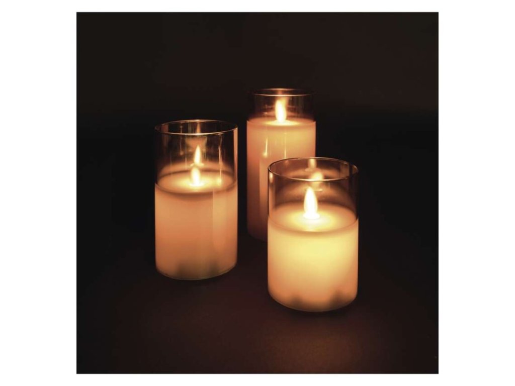 barva drátu: –|barva světla: teplá bílá|časovač: ano|dálkový ovladač: ne|délka přívodu: –|krytí: IP20|materiál: sklo|počet LED: 3× 1|použití: vnitřní|příkon: 3× 0,06 W|prodejní obal: 3 ks, krabice|produkt: svíčka|rozměr: 7,5 × 10/12,5/15 cm|typ napájení: baterie 6× AA (není součástí balení)|vstupní napětí: –|výstupní napětí: 3× 4,5 V DC|záruční doba: 2 roky|zdroj svícení: LED|životnost: 10 000 hodinDoplňkové parametry