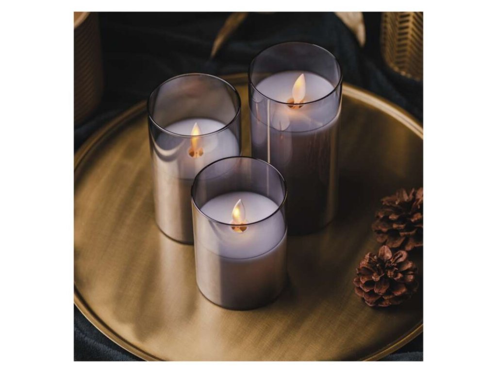 LED dekorace – 3x vosková svíčka ve skle, 6x AA, teplá bílá, časovač