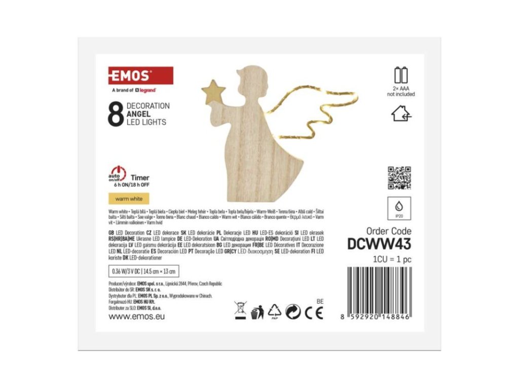barva drátu: –|barva světla: teplá bílá|časovač: ano|dálkový ovladač: ne|délka přívodu: –|krytí: IP20|materiál: dřevo|počet LED: 8|použití: vnitřní|příkon: 0,36 W|prodejní obal: 1 ks, krabice|produkt: anděl|rozměr: 14,5 × 2 × 13 cm|typ napájení: baterie 2× AAA (není součástí balení)|vstupní napětí: –|výstupní napětí: 3 V DC|záruční doba: 2 roky|zdroj svícení: LED|životnost: 10 000 hodinDoplňkové parametry