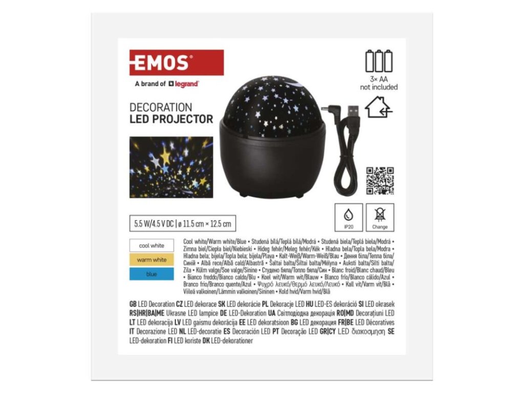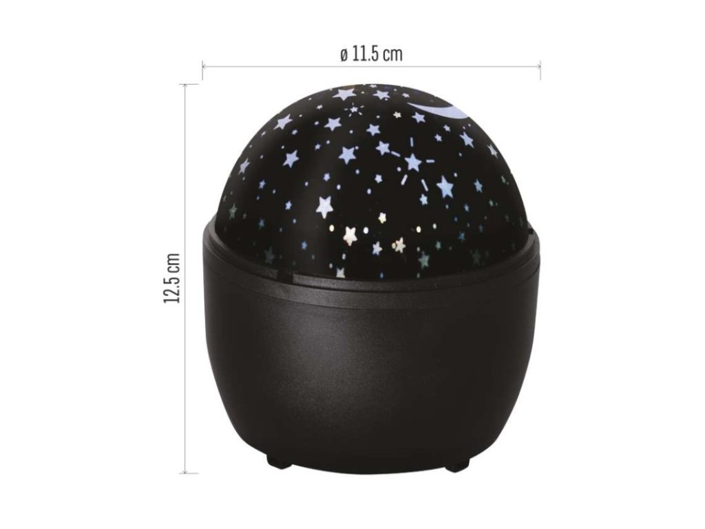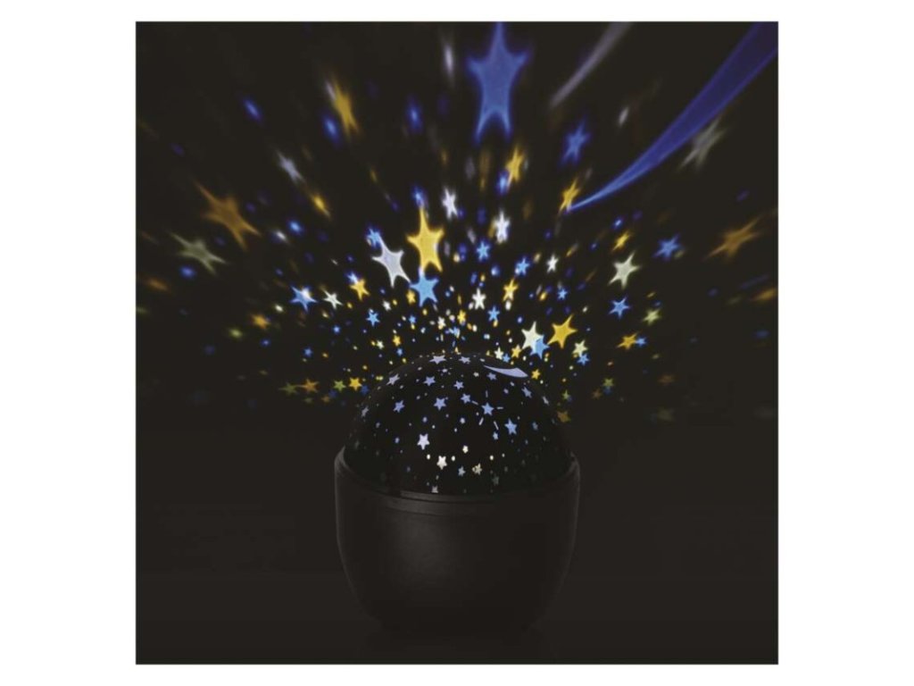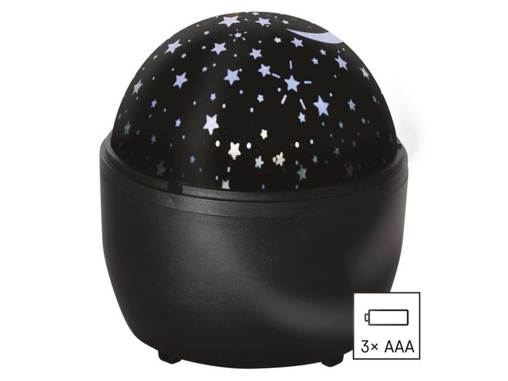 barva světla: studená bílá/teplá bílá/modrá|časovač: ne|dálkový ovladač: ne|délka přívodu: neuvádí se|funkce: rotující světlo|krytí: IP20|materiál: plast|použití: vnitřní|příkon: 5,5 W|prodejní obal: 1 ks, krabice|produkt: projektor|technologie: LED|typ napájení: baterie 3× AA (není součástí balení)|vstupní napětí: neuvádí se|výstupní napětí: 4,5 V DC|vzor: hvězdy|záruční doba: 2 roky|životnost: 10 000 hodinDoplňkové parametry