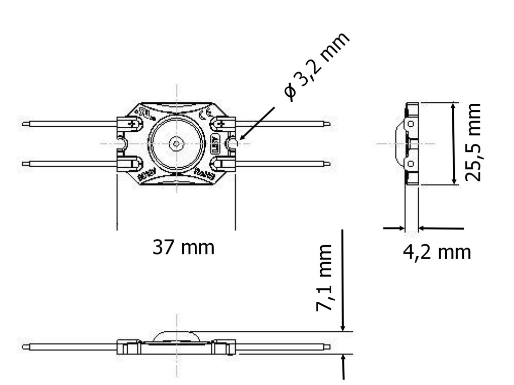 LED modul 0,72W 3725-170-12V speciálně pro úzké bannery od 3cm, díky speciálné čočce je LED světlo rozptýlenější a nedělá body jako běžné moduly. LED moduly s krytím IP65 jsou určené pro světelnou reklamu a další LED aplikace pro reklamní účely. Moduly mají dlouhou životnost, vysokou svítivost a použití nová technologie vstřikování IP krytí. Moduly jsou vybaveny samolepící folií pro snadné připevnění. Tyto moduly jsou osazeny rozptylovými čočkami pro rovnoměrné nasvícení větší plochy. Prodloužená záruka na 5 let. Pro dosažení co nejdelší životnosti je potřeba zajistit cirkulaci vzduchu k čipům, aby nedocházelo k přehřívání. Délka kabelu mezi jednotlivými moduly je 100mm. Specifikace LED modulu Barva světla Teplá bílá Studená bílá Barevná teplota 3000K 7000K Světelný tok >55lm >60lm LED čip 2835 SMD San'an Úhel svitu 170° Vstupní napětí 12V DC Příkon 0,72W/ks CRI >80 Krytí IP65 Životnost až 50 000 hodin Provozní teplota -20°C až +60°C Balení 100ks Rozměry viz. obrázek Záruka 5 let Maximální délka zapojení 50ks Stmívatelný ano Doporučená instalace při propustnosti materiálu 32%. Hloubka (mm) lightboxu Vzdálenost (mm) Hustota (ks/1m2) Osvětlení (lux) Dz=35 Dx=80 Dy=80 144 5400-5800 Dz=40 Dx=80 Dy=80 144 5200-5500 Dz=45 Dx=80 Dy=80 144 5000-5300 Dz=50 Dx=80 Dy=80 144 4800-5100 Dz=55 Dx=80 Dy=80 144 4600-4850Doplňkové parametry