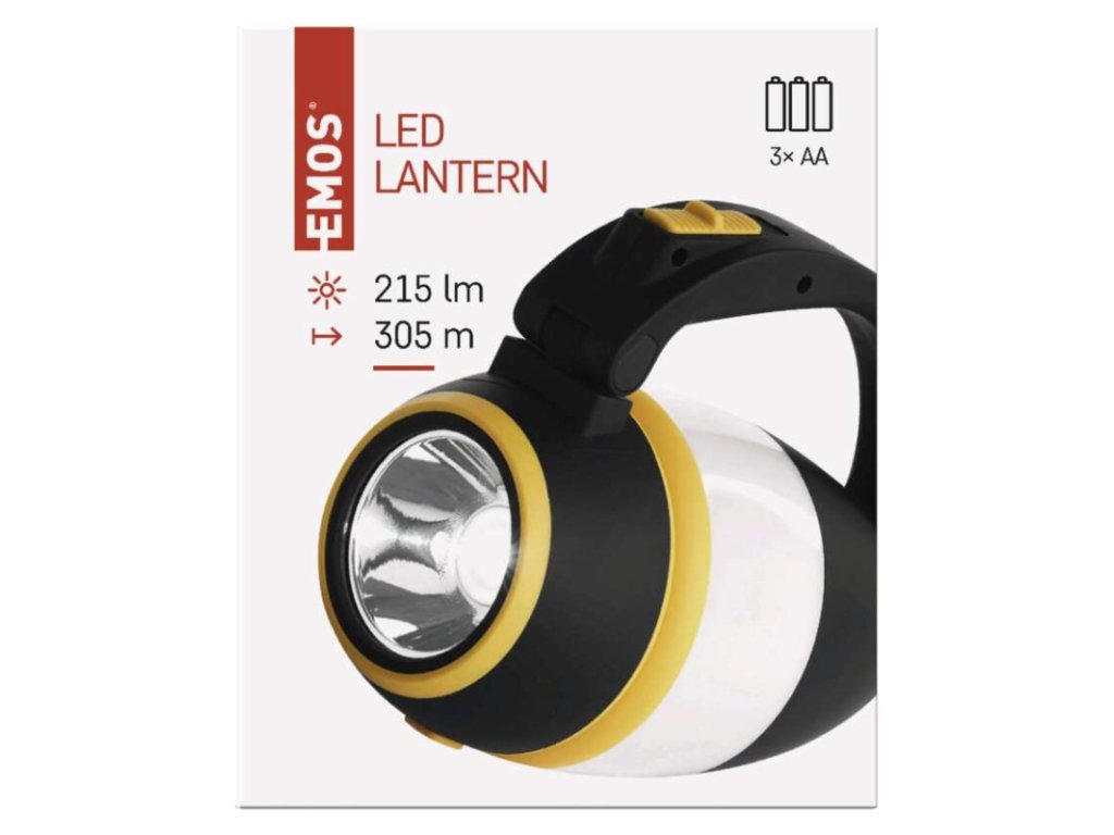 barva: černo-žlutá|baterie součástí balení: ne|doba nabíjení: neuvádí se|doba svícení: 90 h|doba svícení detail: neuvádí se|dosvit: neuvádí se|fokus: ne|hmotnost: 210 g|LED indikace nabíjení: neuvádí se|LED indikace stavu akumulátoru: neuvádí se|materiál: plast|maximální dosvit: 305 m|maximální světelný tok: 215 lm|nabíjecí: ne|napájení: 3× AA|nárazuvzdornost: ne|počet režimů svícení: 5|příslušenství: neuvádí se|prodejní obal: 1 ks, krabice|režimy svícení: neuvádí se|rozměr: 87 × 130 × 155 mm|speciální funkce: neuvádí se|světelný tok: neuvádí se|typ baterie: LR6 (1,5 V)|typ napájecího konektoru: neuvádí se|voděodolnost: ne|vybavení: neuvádí se|záruční doba: 2 roky|zdroj světla: SMD LED + LED|značka: EMOSDoplňkové parametry