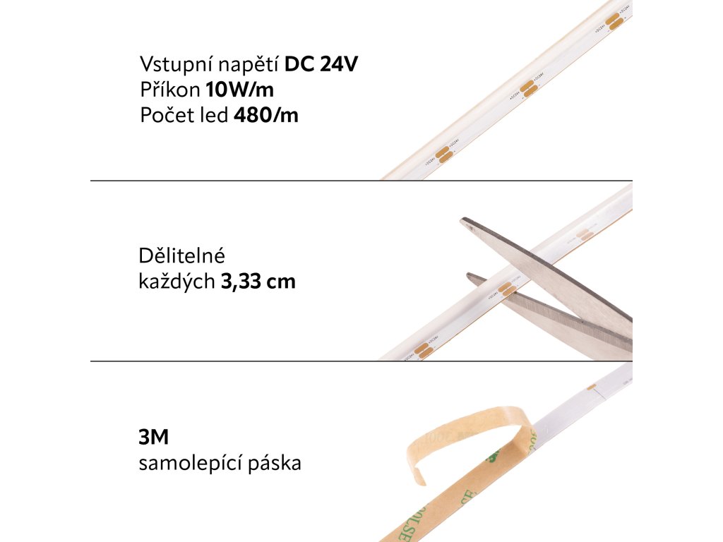 COB LED pásek s bočním svitem je vhodný pro nasvícení hran se svitem dopředu. Svojí konstrukcí je také vhodný pro nasvícení oblých a ostrých tvarů. Díky COB technologii nejsou viditelné jednotlivé body a LED pásek vytvárí kontinuální světelnou čáru. LED pásek prodáváme pouze na celé metry. Specifikace LED pásku Barevná varianta Teplá bílá Denní bílá Studená bílá Teplota 3000K 4000K 6000K Světelný tok 710lm/m 770lm/m 790lm/m CRI 80 80 80 Vstupní napětí 24V DC Příkon 10W/m Počet LED 480/m Úhel svitu 120° Provozní teplota -15°C až max. 60°C Šířka pásku 8mm Výška pásku 2mm Návin na kotouči 5m Krytí IP65 3M samolepící páska ANO Dělitelnost Každých 33,3mm Maximální délka zapojení 5m Stmívatelné ANO Záruka 3 roky Životnost Až 50 000h K LED pásku si vyberte také zdroje, profily a stmívače. Přečtěte si více o teplotě světla. LED pásek lze zapojit z jedné strany v maximálně v délce, která je uvedená v tabulce. Pokud zapojíte pásek ve větší délce, bude na konci pásku docházet k úbytkům svítivosti. Pro delší zapojení je potřeba zapojit pásek z obou stran.Doplňkové parametry