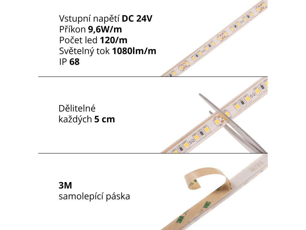 LED pásek v krytí IP68 prodáváme pouze na celé metry. LED pásek je vždy dodáván s koncovkou na pásku a napájenými kabely. K LED pásku doporučujeme dokoupit koncovku 12IP68, kterou v případě ustřižení LED pásku použijete. Pro zachování IP krytí je nutné koncovku zalepit například pomocí silikonu. Originální 10m návin má napájen kabely z obou stran. Díky nízké spotřebě, malým rozměrům a snadné montáži je možné LED pásek využít jako osvětlení pro kuchyňské linky, v šatnách, na schodištích, do podhledů apod. Specifikace LED pásku Barevná varianta Teplá bílá Denní bílá Studená bílá Teplota 3000K 4500K 6500K Světelný tok 1050lm/m 1080lm/m 1100lm/m CRI 80 80 80 Vstupní napětí 24V DC Příkon 9,6W/m Počet LED 120/m Úhel svitu 120° LED čip 2835 SMD San'an Provozní teplota -15°C až max. 60°C Životnost Až 50 000h Šířka pásku 10mm Výška pásku 4mm Návin na kotouči 10m Krytí IP68 3M samolepící páska ANO Dělitelnost Každých 5cm Maximální délka zapojení 10m Stmívatelné ANO Záruka 3 roky K LED pásku si vyberte také zdroje, profily a stmívače. LED pásek lze zapojit z jedné strany v maximálně v délce, která je uvedená v tabulce. Pokud zapojíte pásek ve větší délce, bude na konci pásku docházet k úbytkům svítivosti. Pro delší zapojení je potřeba zapojit pásek z obou stran. Co je teplota světla a jak ji správně vybrat? To se dozvíte zde.Doplňkové parametry