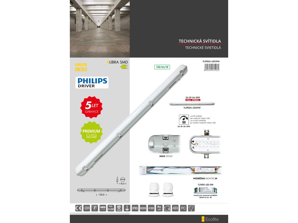 Prachotěsné průmyslové LED svítidlo LIBRA SMD je plnohodnotná náhrada za zářivkové prachotěsy. Využívá vysoce úspornou technogii SMD (čip 2835), vynikající předřadník značky Philips a vyznačuje se vysokou odolností proti prachu a vlhkosti IP65. Je tak vhodné například do výrobních, hal, skladů, ale i k venkovnímu použítí. Tento vylepšený model je vybaven nerezovými sponami a umožňuje průběžnou montáž 3F. Současně nabízí možnost krokového přepínání výkonu 24W / 29W / 34W nebo 39W pomocí posuvníku DIP switch. Životnost LED zdroje je zhruba 30 000 hodin.Doplňkové parametry