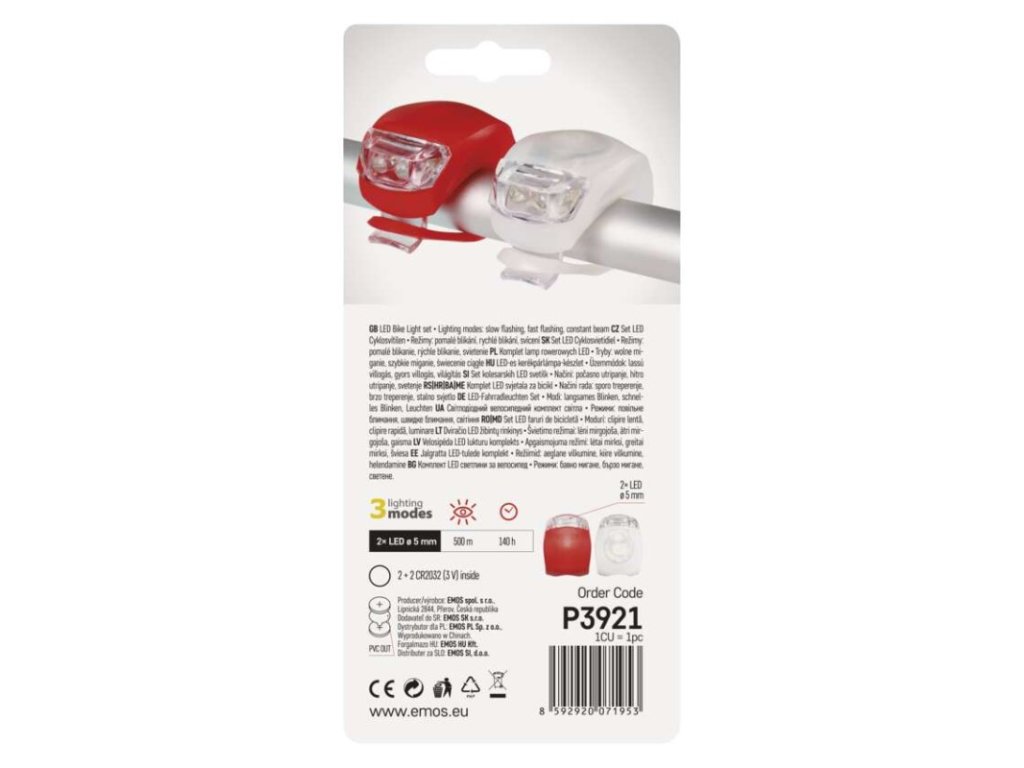 barva: červená, bílá|baterie součástí balení: ano|doba nabíjení: neuvádí se|doba svícení: 140 h|doba svícení detail: 140 h (blikání)|dosvit: LED 100 % – 13 m|fokus: ne|hmotnost: neuvádí se|LED indikace nabíjení: neuvádí se|LED indikace stavu akumulátoru: neuvádí se|materiál: silikon/plast|maximální dosvit: 13 m|maximální světelný tok: 10 lm|nabíjecí: ne|napájení: 2× 2 CR2032|nárazuvzdornost: ano|počet režimů svícení: 3|příslušenství: držák na jízdní kolo|prodejní obal: 1 ks, blistr|režimy svícení: bliká pomalu, bliká rychle, svítí|rozměr: 90 × 29 × 25 mm|speciální funkce: neuvádí se|světelný tok: LED 100 % – 10 lm|typ baterie: CR2032 (3 V)|typ napájecího konektoru: neuvádí se|voděodolnost: ano (IP43)|vybavení: neuvádí se|záruční doba: 2 roky|zdroj světla: 2× LED bílá, 2× LED červená|značka: EMOSDoplňkové parametry