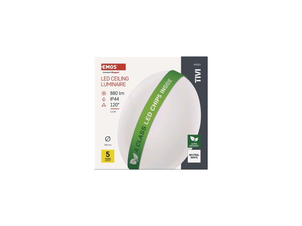 barva světla: neutrální bílá|barva těla: bílá|dálkový ovladač: ne|další funkce: –|do chodby a na schodiště: ano|do dílny a garáže: ano|do kanceláře: ano|do koupelny: ano|do kuchyně: ano|do obýváku, ložnice a dětského pokoje: ano|dosah senzoru: neuvádí se|flicker-free: nebliká|frekvence: 50/60 Hz|index podání barev (CRI): Ra > 80|jazyky aplikace: –|kategorie: PROFI|kompatibilita: –|krytí: IP44|materiál difuzoru: plast|materiál LGP: neuvádí se|materiál těla: ocelový plech|montážní otvor: neuvádí se|možnost stmívání: ne|náhrada za žárovku: 60 W|napětí: 220–240 V|na zahradu a balkon: ano|notifikace do mobilní aplikace: ne|obsah balení: –|ovládání hlasovými asistenty: ne|podporované OS: –|pohybový senzor: ne|přenosová frekvence: –|příkon: 5,2 W|prodejní obal: 1 ks, krabice|protokol: –|proud: 45 mA|řada: TIVI|rozměr: průměr 250 × 70 mm|světelná účinnost: 168 lm/W|světelný tok: 880 lm|teplota chromatičnosti: 4 000 K|tvar: kruh|typ difuzoru: mléčný|typ svítidla: klasické svítidlo|účiník: > 0,5|UGR<: neuvádí se|úhel vyzařování: 120°|umístění: stropní/nástěnné|výstupní proud ze zdroje: neuvádí se|záruční doba: 5 let|zdroj světla: LED|životnost: 50 000 hodin|způsob montáže: přisazenéDoplňkové parametry