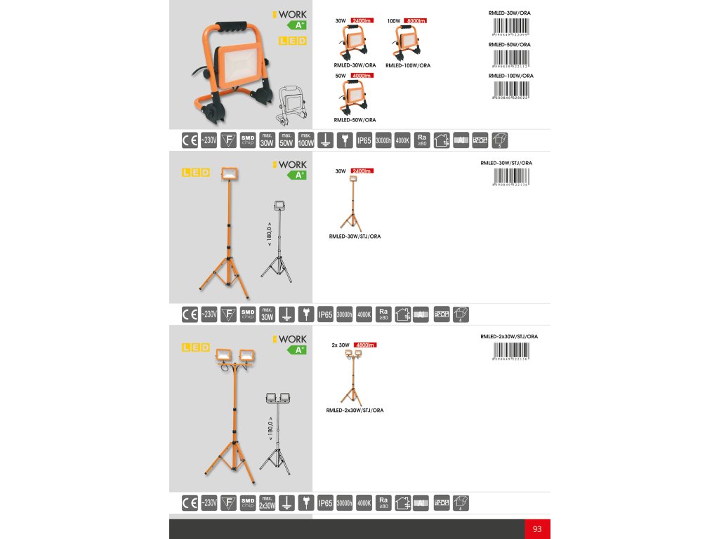 LED reflektor WORK s typovým označením RMLED je rozkládací reflektor, který se vyznačuje vysokou přenosností díky praktickému stojanu a madlu. Nahrazuje klasické halogenové typy mají často až 10x vyšší spotřebu a pomalý náběh. O úsporný chod se starají vysoce účinné a moderní čipy typu SMD. Díky vysokému krytí IP65 najde výrobek uplatnění i venku při osvětlování staveb, dílen nebo budov.Doplňkové parametry