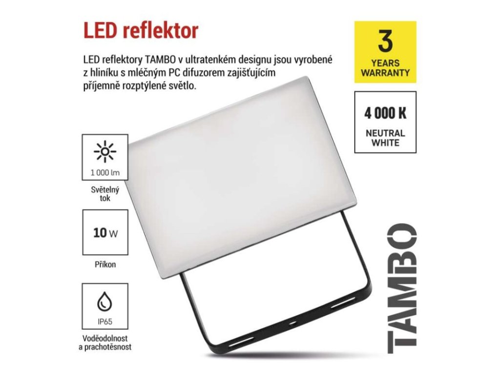 akumulátor: neuvádí se|barva: černá|barva světla: neutrální bílá|délka přívodního kabelu: 30 cm|doba svícení na AKU: neuvádí se|dosah PIR senzoru: nemá PIR|energetická třída použitého světelného zdroje: –|flicker-free: ano|frekvence: 50/60 Hz|index podání barev (CRI): Ra > 80|kategorie: CLASSIC|krytí: IP65|materiál difuzoru: plast (PC)|materiál přívodního kabelu: guma|materiál těla: hliník|napájení: ze sítě|napětí: 220–240 V~|PIR senzor: ne|počet průchozích zásuvek: 0|použití: povrchová montáž|příkon: 10 W|prodejní obal: 1 ks, krabice|proud: 50 mA|řada: TAMBO|rozměr: 105 × 102 × 55 mm|rozsah pracovní teploty: -20 °C až +40 °C|stmívání: ne|stupeň ochrany proti mechanickým nárazům: IK08|světelná účinnost: 100 lm/W|světelný tok: 1 000 lm|teplota chromatičnosti: 4 000 K|typ přívodního kabelu: neuvádí se|typ průchozích zásuvek: neuvádí se|typ stmívání: –|účiník: > 0,9|úhel vyzařování: 120°|záruční doba: 3 roky|zdroj světla: LED|životnost: 25 000 hodin|zkušební žárovka součástí balení: neDoplňkové parametry