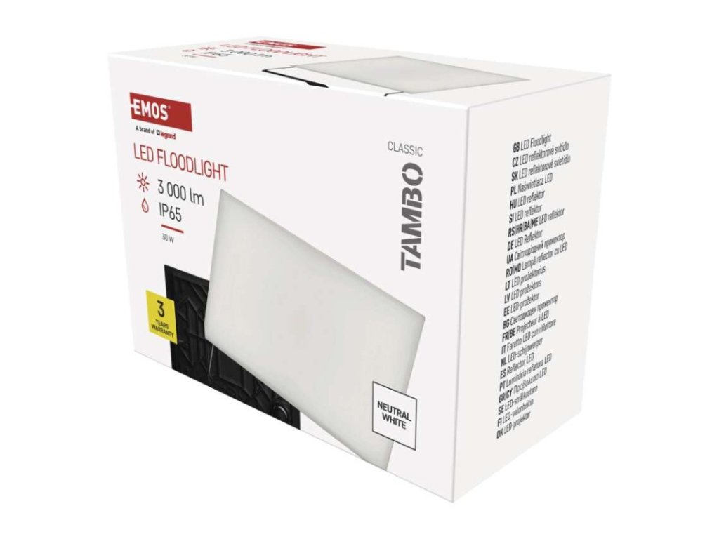 akumulátor: neuvádí se|barva: černá|barva světla: neutrální bílá|délka přívodního kabelu: 30 cm|doba svícení na AKU: neuvádí se|dosah PIR senzoru: nemá PIR|energetická třída použitého světelného zdroje: –|flicker-free: ano|frekvence: 50/60 Hz|index podání barev (CRI): Ra > 80|kategorie: CLASSIC|krytí: IP65|materiál difuzoru: plast (PC)|materiál přívodního kabelu: guma|materiál těla: hliník|napájení: ze sítě|napětí: 220–240 V~|PIR senzor: ne|počet průchozích zásuvek: 0|použití: povrchová montáž|příkon: 30 W|prodejní obal: 1 ks, krabice|proud: 130 mA|řada: TAMBO|rozměr: 165 × 114 × 55 mm|rozsah pracovní teploty: -20 °C až +40 °C|stmívání: ne|stupeň ochrany proti mechanickým nárazům: IK08|světelná účinnost: 100 lm/W|světelný tok: 3 000 lm|teplota chromatičnosti: 4 000 K|typ přívodního kabelu: neuvádí se|typ průchozích zásuvek: neuvádí se|typ stmívání: –|účiník: > 0,9|úhel vyzařování: 120°|záruční doba: 3 roky|zdroj světla: LED|životnost: 25 000 hodin|zkušební žárovka součástí balení: neDoplňkové parametry
