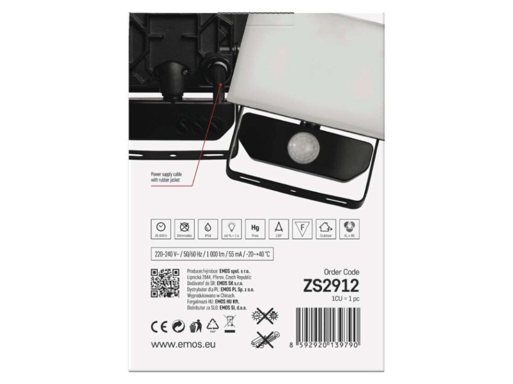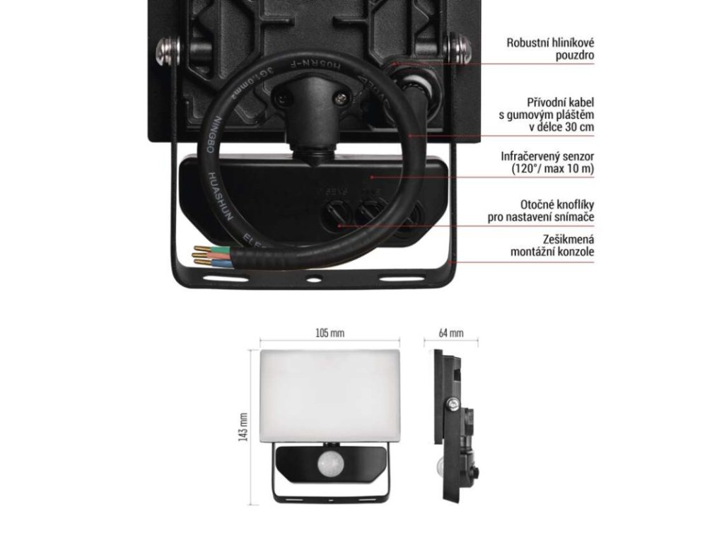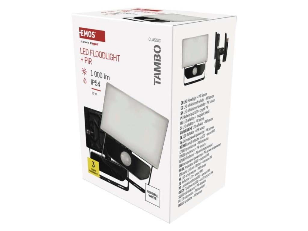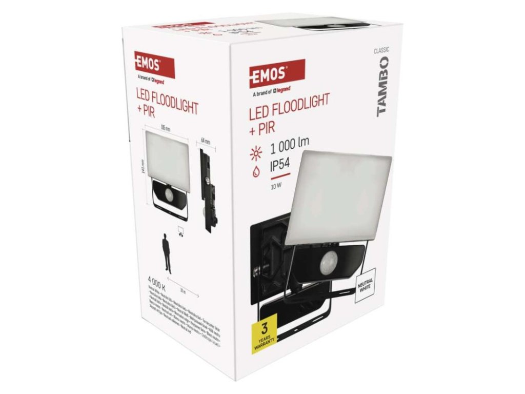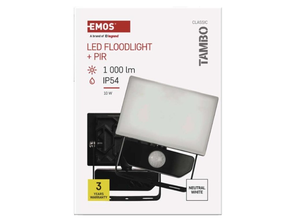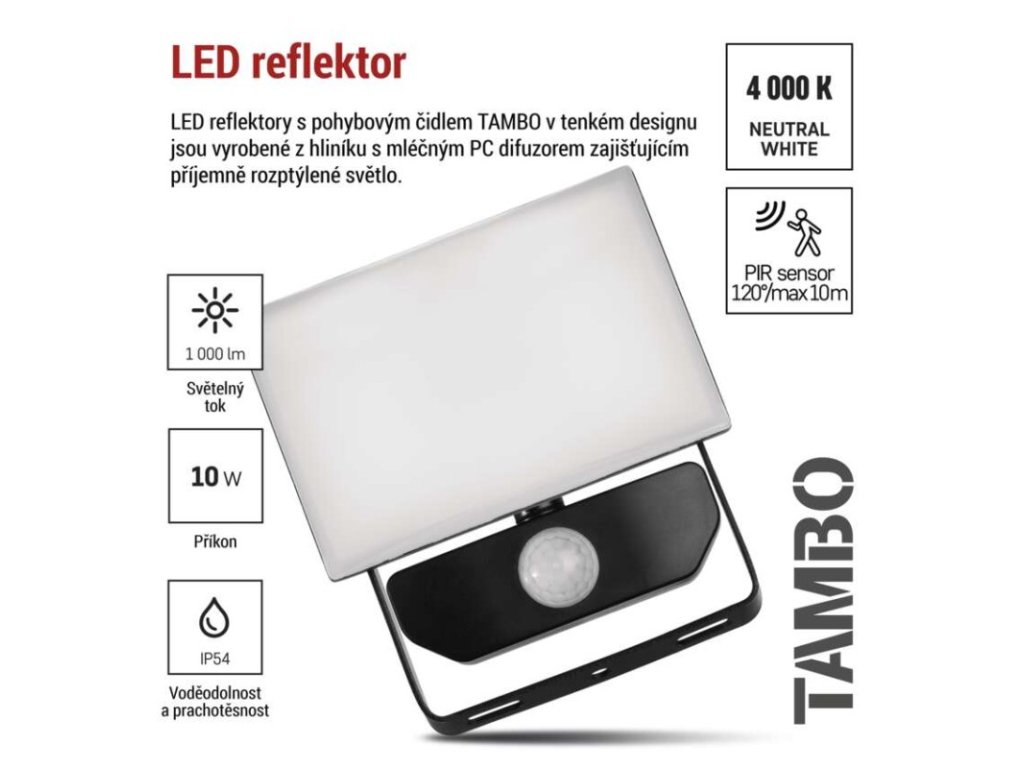 akumulátor: neuvádí se|barva: černá|barva světla: neutrální bílá|délka přívodního kabelu: 30 cm|doba svícení na AKU: neuvádí se|dosah PIR senzoru: 10 m|energetická třída použitého světelného zdroje: –|flicker-free: ano|frekvence: 50/60 Hz|index podání barev (CRI): Ra > 80|kategorie: CLASSIC|krytí: IP54|materiál difuzoru: plast (PC)|materiál přívodního kabelu: guma|materiál těla: hliník|napájení: ze sítě|napětí: 220–240 V~|PIR senzor: ano|počet průchozích zásuvek: 0|použití: povrchová montáž|příkon: 10 W|prodejní obal: 1 ks, krabice|proud: 55 mA|řada: TAMBO|rozměr: 105 × 143 × 64 mm|rozsah pracovní teploty: -20 °C až +40 °C|stmívání: ne|stupeň ochrany proti mechanickým nárazům: IK06|světelná účinnost: 100 lm/W|světelný tok: 1 000 lm|teplota chromatičnosti: 4 000 K|typ přívodního kabelu: neuvádí se|typ průchozích zásuvek: neuvádí se|typ stmívání: –|účiník: > 0,9|úhel vyzařování: 120°|záruční doba: 3 roky|zdroj světla: LED|životnost: 25 000 hodin|zkušební žárovka součástí balení: neDoplňkové parametry